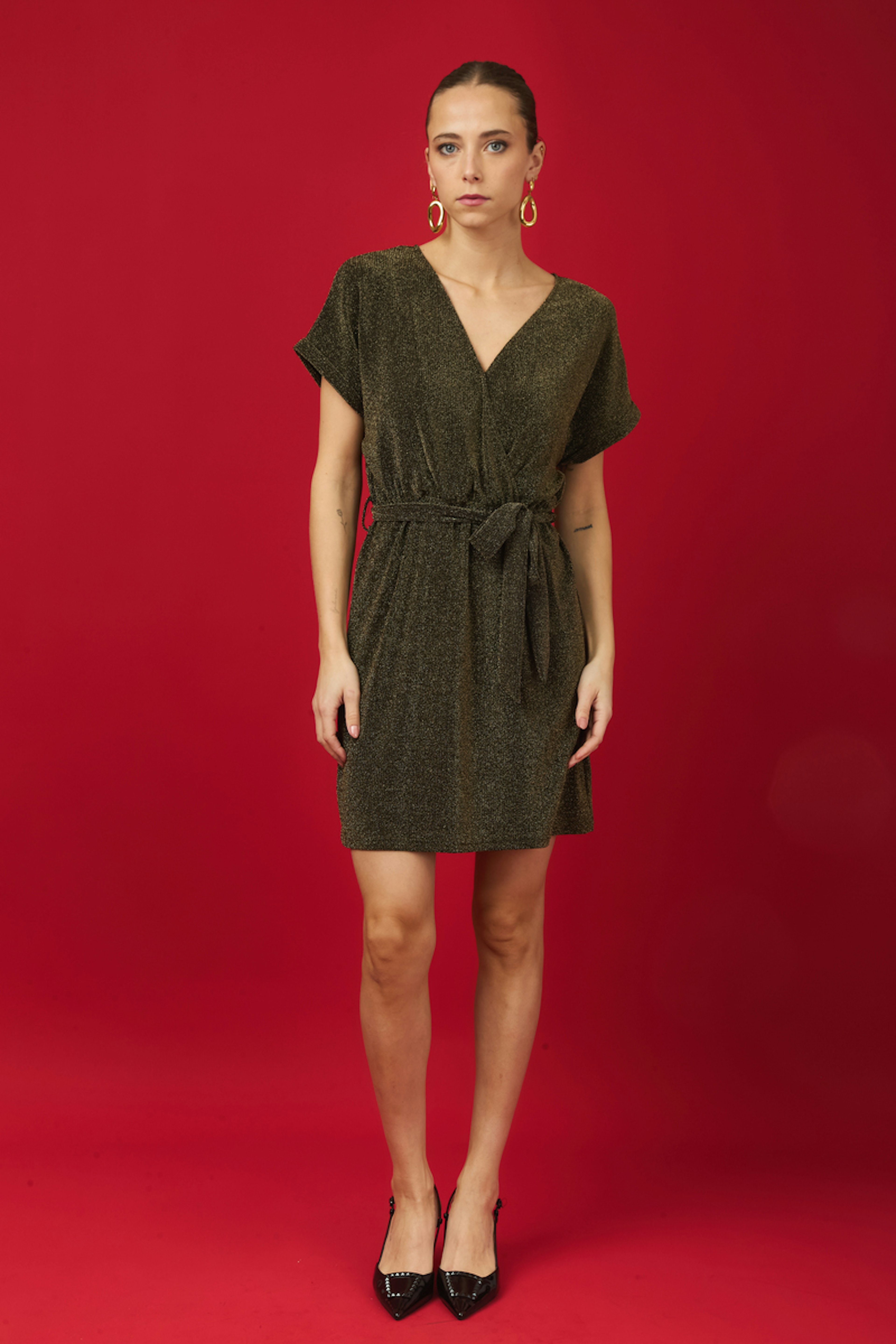 Illuminez votre soirée avec cette robe dorée. Associez-la à des escarpins noirs et des accessoires minimalistes pour un look élégant. Parfait en toute saison. • Robe courte en jersey lurex • Encolure croisée • Taille élastiquée • Ceinture à nouer • Bouton pression invisible