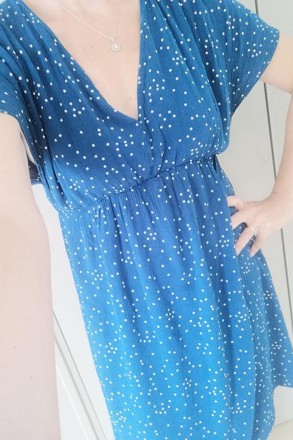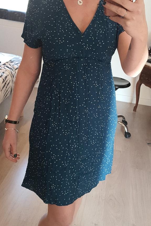 Louis est une robe รฉlรฉgante bleue canard avec des pois blancs. On aime son tissu en viscose fluide idรฉal pour la mi-saison.