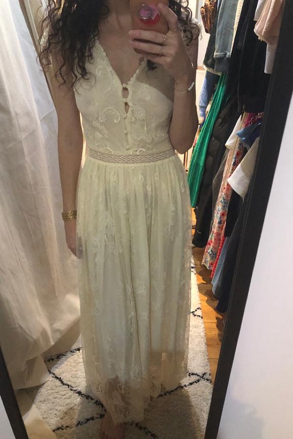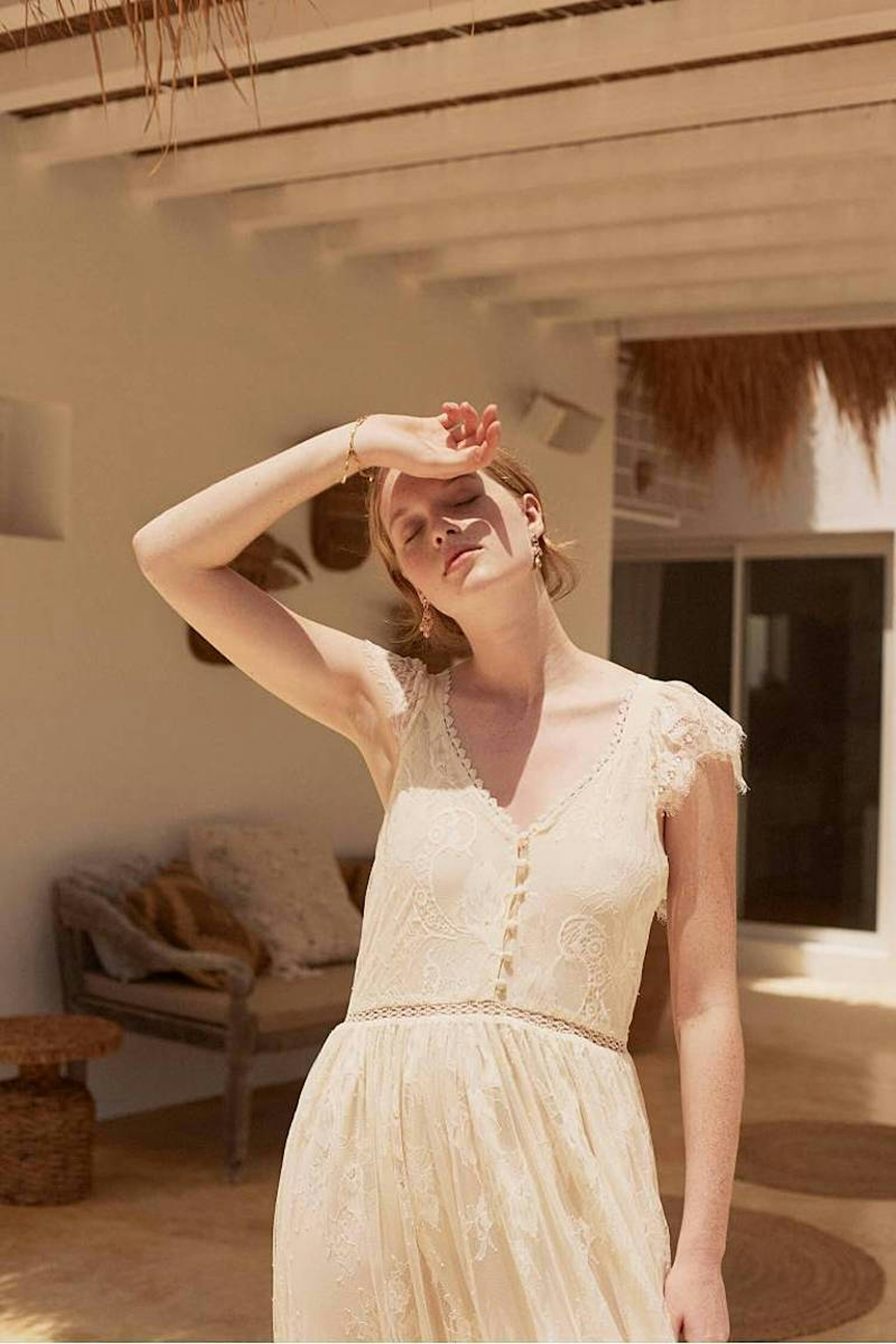 โข Robe longue de cรฉrรฉmonie habillรฉe au style bohรจme chic en soie et dentelle โข Volants aux emmanchures โข Dos nus plongeant โข Lisรฉrรฉ en dentelle ร l'encolure โข Cordon ร nouer dans le dos โข Taille soulignรฉe par une bande en dentelle โข Ouverture boutonnรฉe sur le devant โข Doublure โข Fermeture รฉclair sur le cรดtรฉ