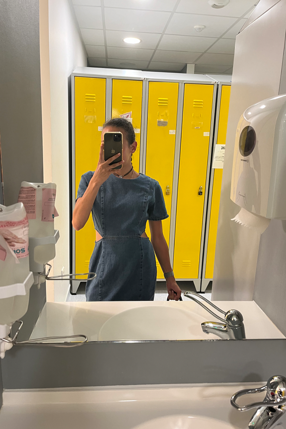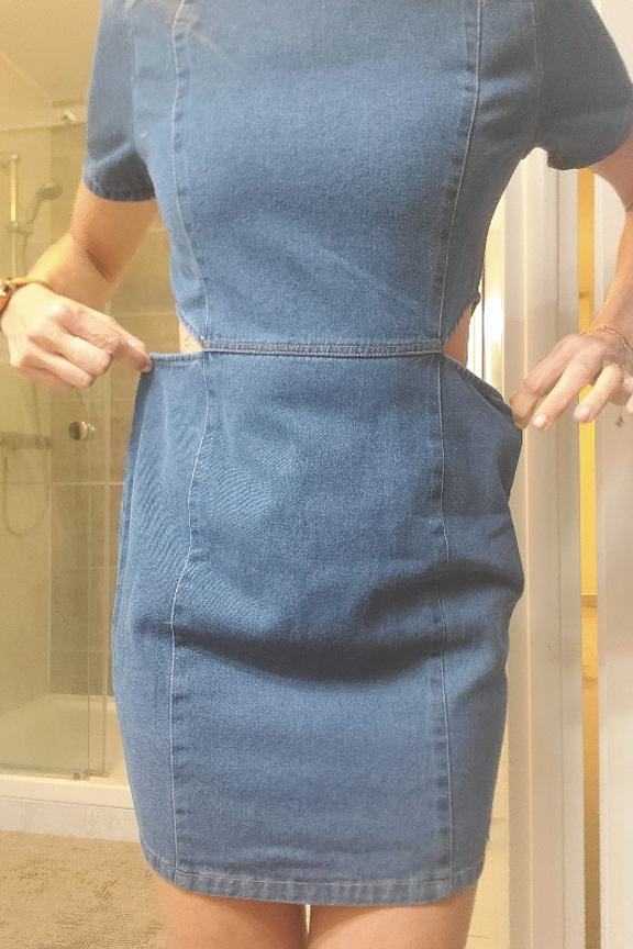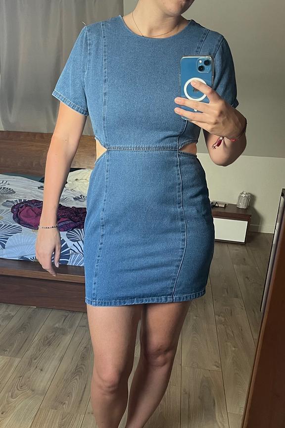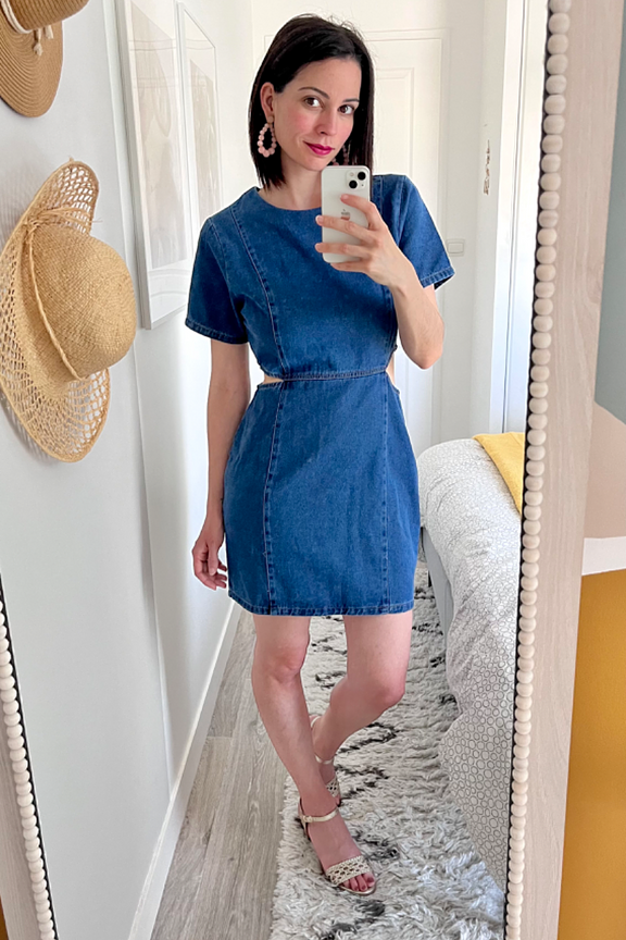 Associez cette robe Daphnea avec des sandales nude et des accessoires dorés pour un look estival chic. Parfaite pour toute saison. • Robe courte en denim • Manches courtes • Découpes latérales • Col rond • Coloris bleu denim