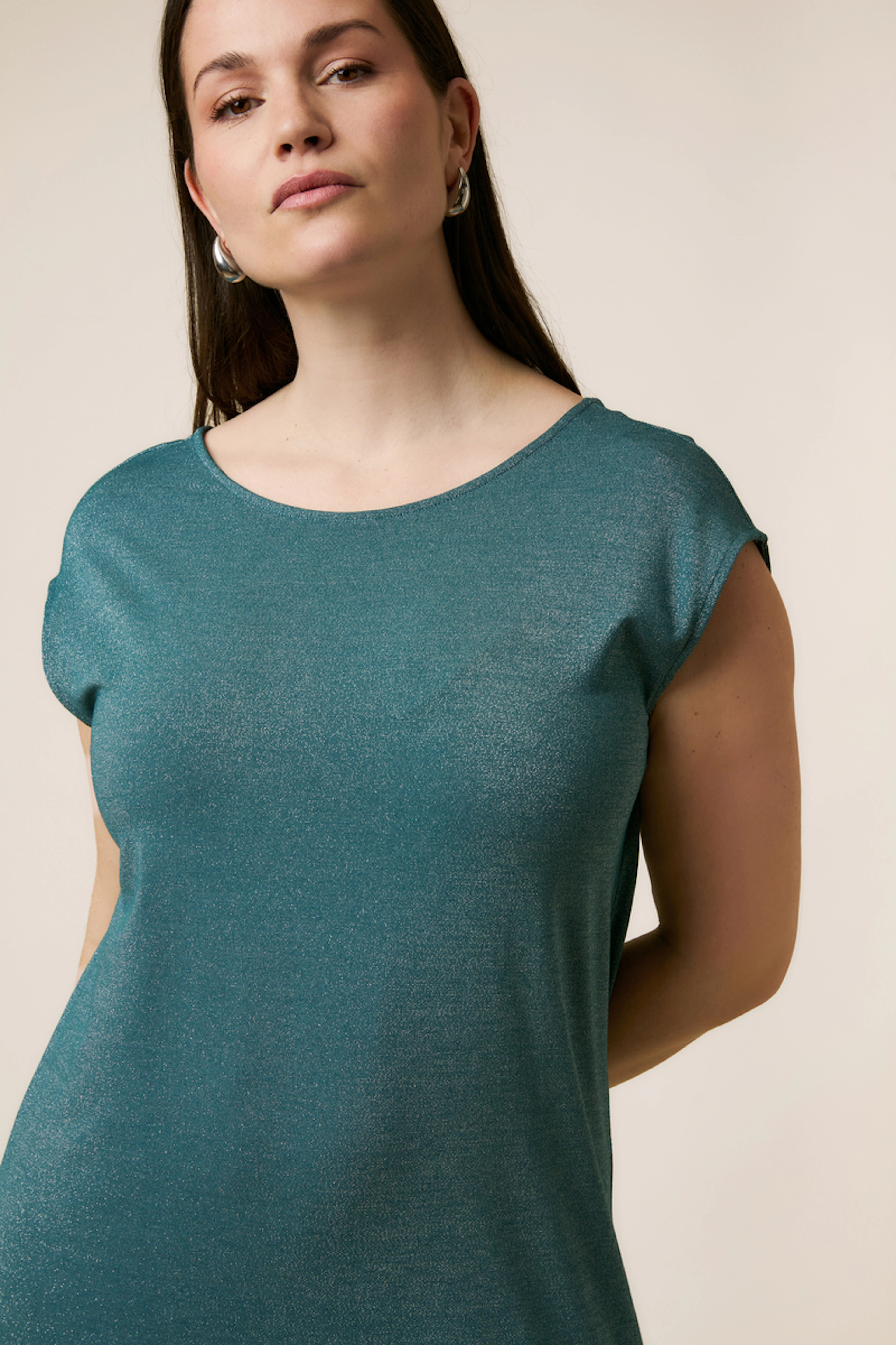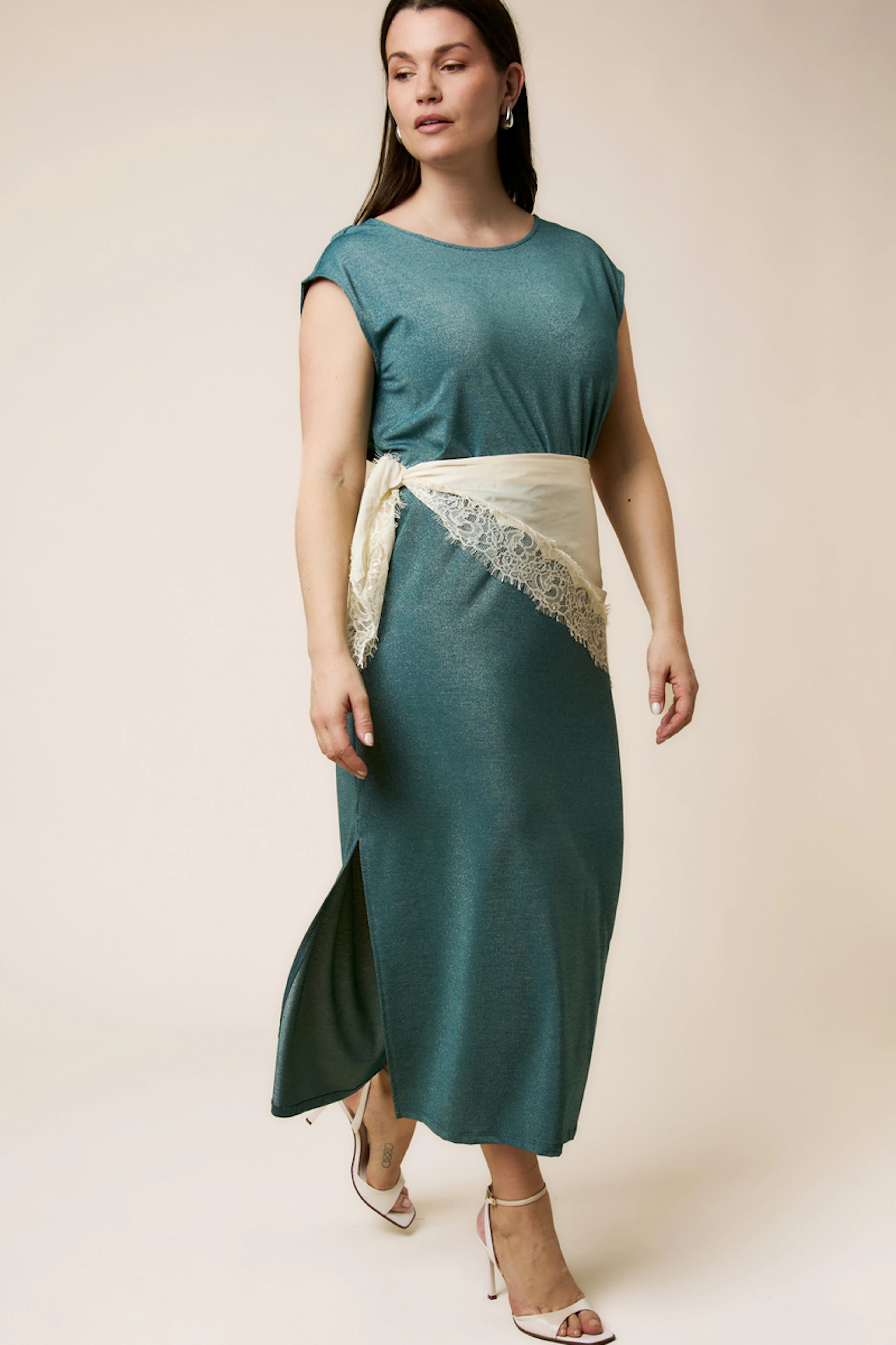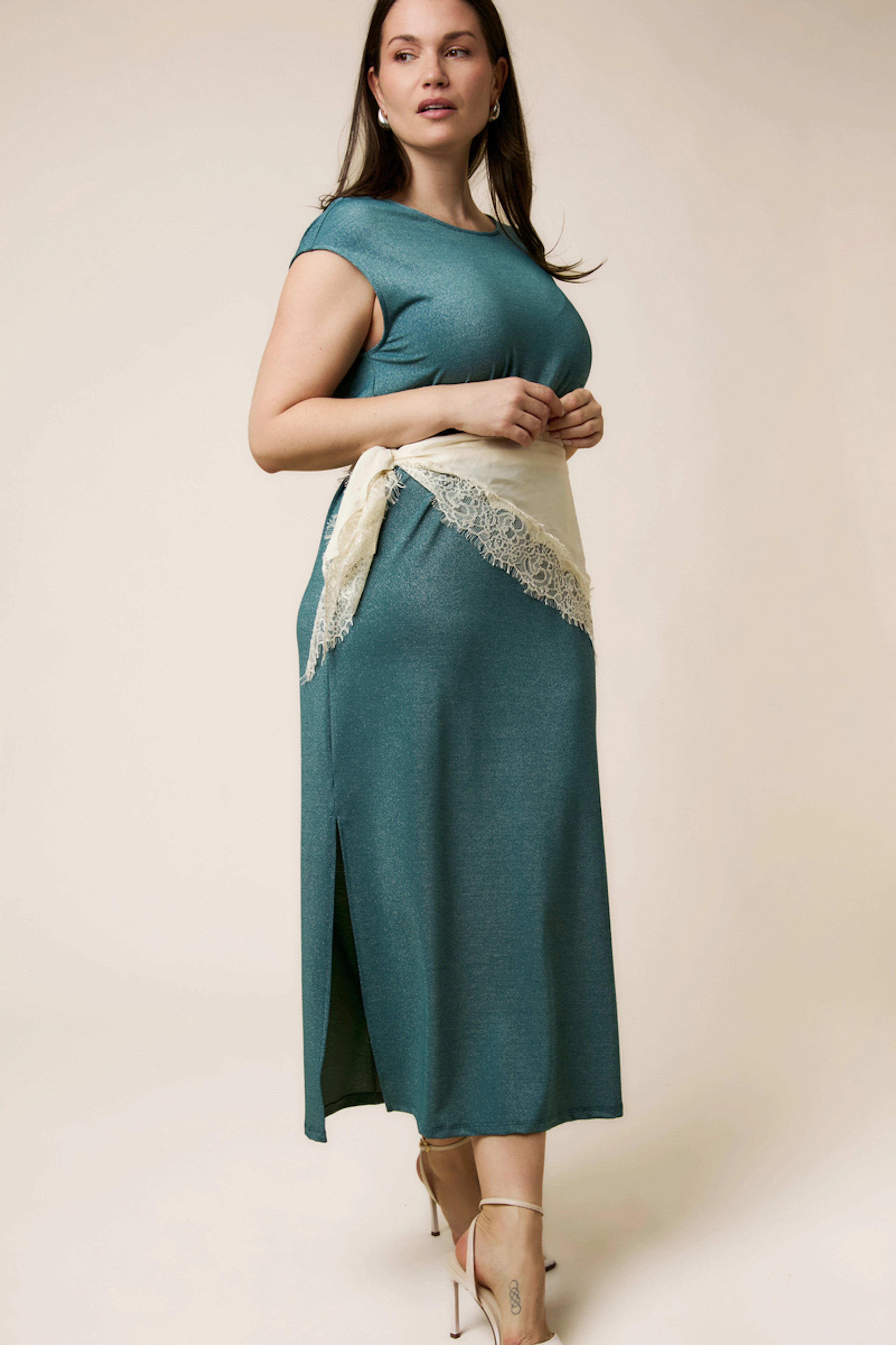Ajoutez des sandales à talons et un sac à main scintillant pour une allure estivale chic. • Robe longue • Manches courtes • Fente latérale • Taille ceinturée • Tissu scintillant