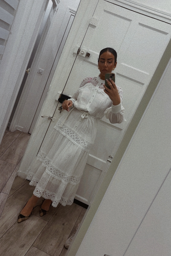Un indispensable pour vos escapades estivales! Associez cette robe avec des sandales dorées et un chapeau pour une allure chic et détendue. • Robe longue en coton • Manches longues en dentelle • Col montant élégant • Empiècements en crochet • Boutonnage subtil sur le devant