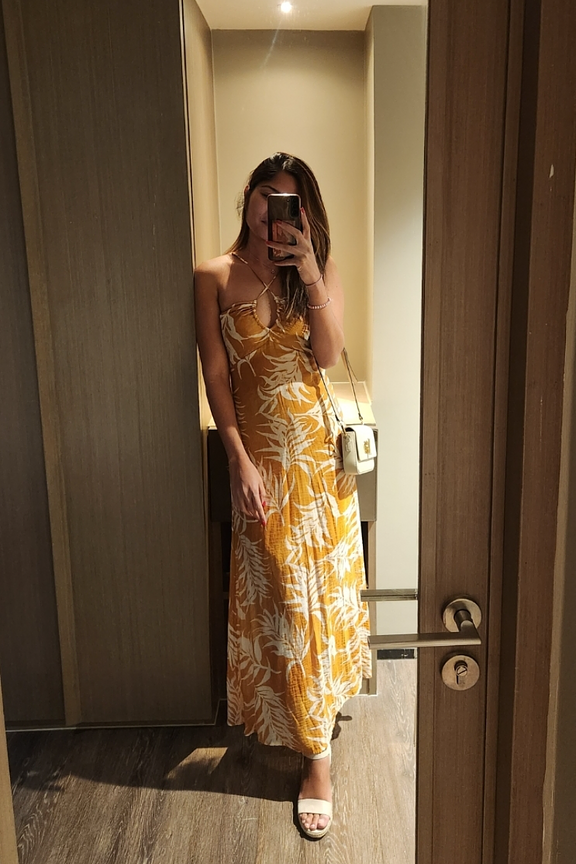 Accompagnez cette robe estivale de sandales dorรฉes et d'un chapeau de paille pour un look parfait en bord de mer. Idรฉale pour l'รฉtรฉ ! โข Robe fluide et legรจre โข Jupe รฉvasรฉe โข Imprimรฉ feuilles