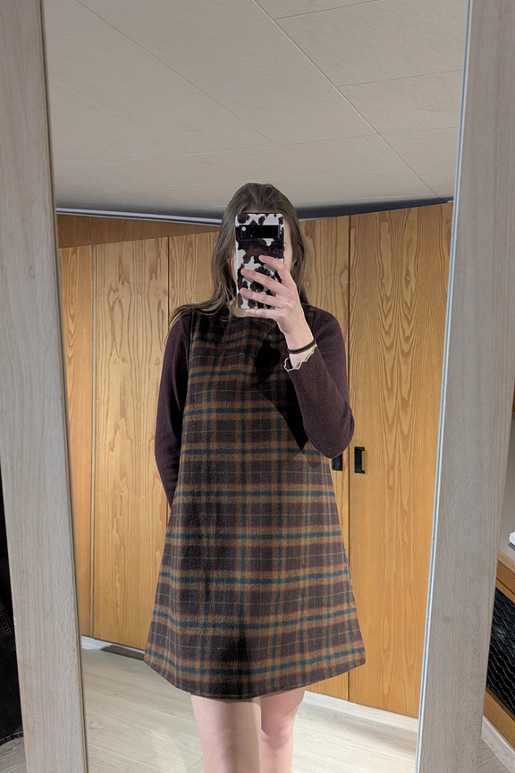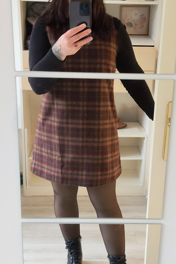 “Sympathique avec un sous pull bordeaux, des collants marron et bottes cavalières”
