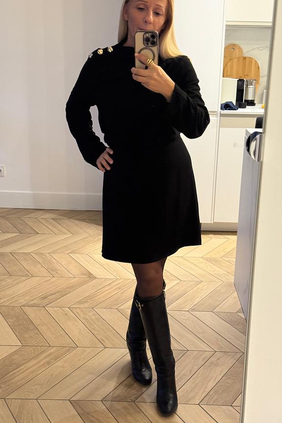 Associez cette robe avec des bottines en cuir et un chapeau feutre. Parfaite pour un look chic en hiver. • Robe droite • Manches longues • Col montant • Détail de bouton à l'épaule • Texture lisse et élégante