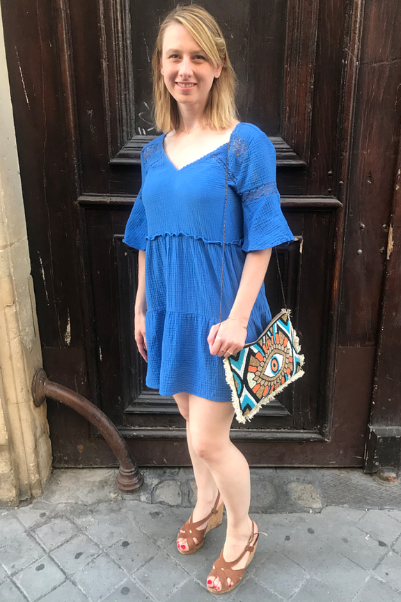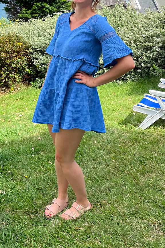 โข Robe en double gaze de coton bleue โข Empiรจcements en dentelle โข Dos ouvert avec cordon ร nouer โข Coupe droite, assez large