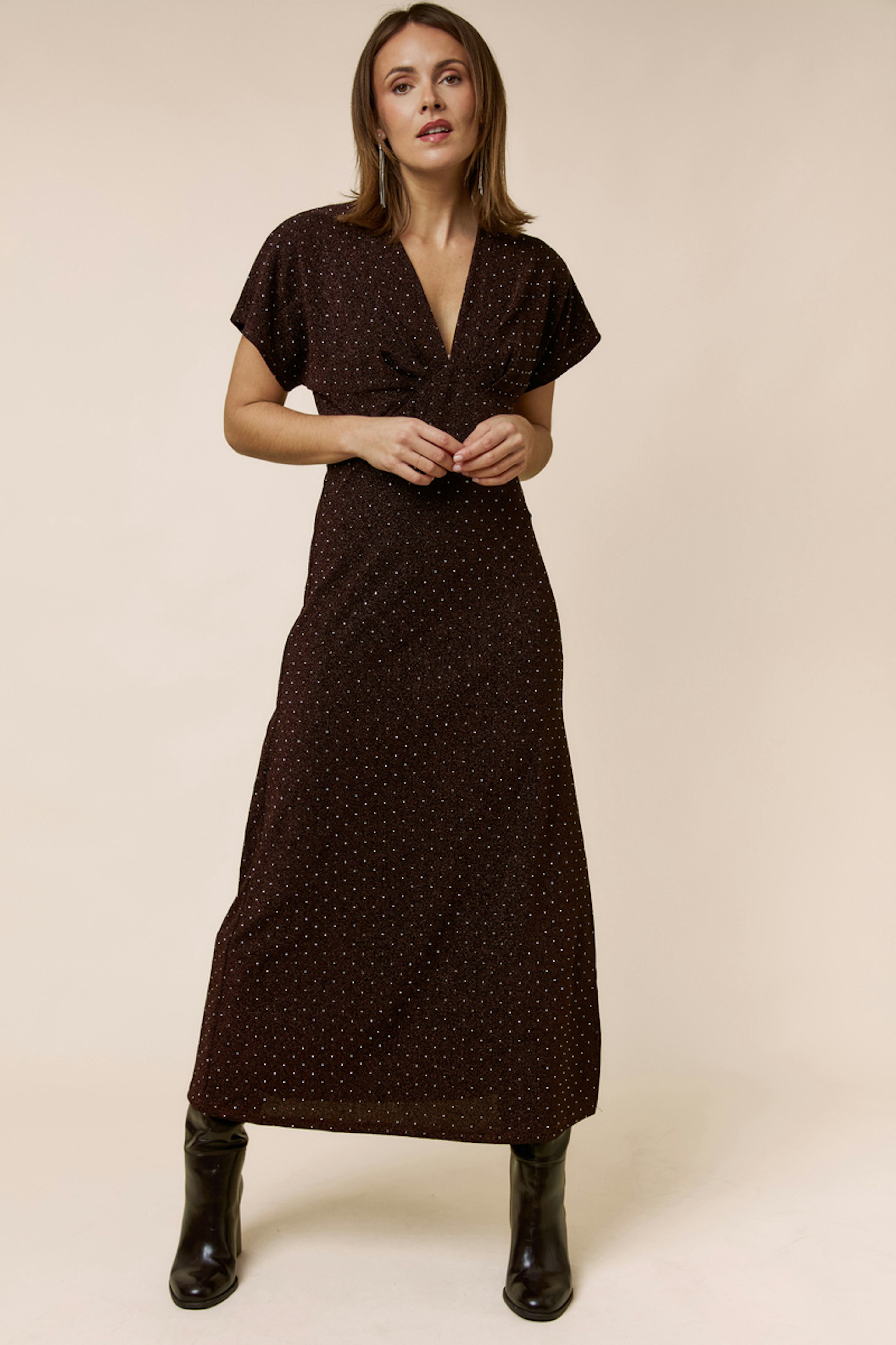Pour un style chic cet hiver, associez cette robe à des bottes en cuir et un manteau beige. • Robe longue à imprimé • Décolleté en V • Manches courtes • Fente latérale • Motif scintillant élégant