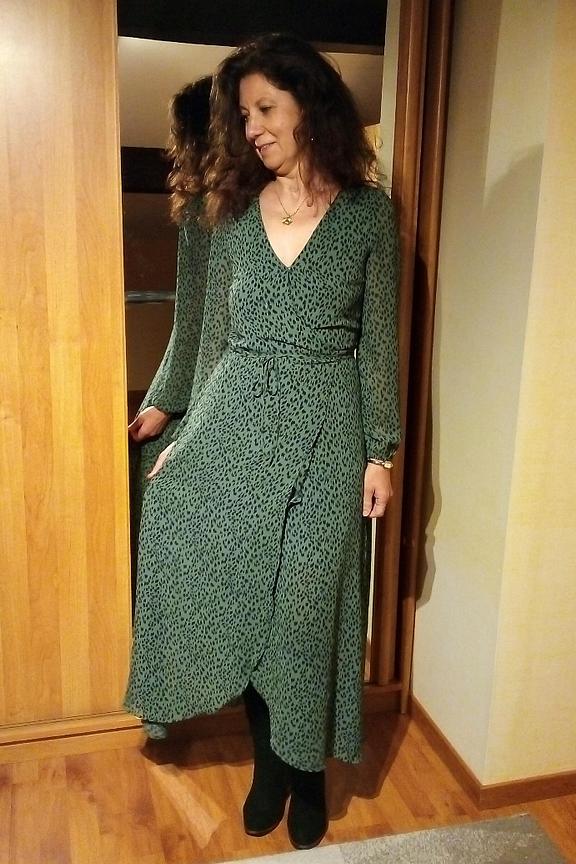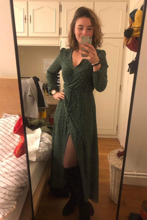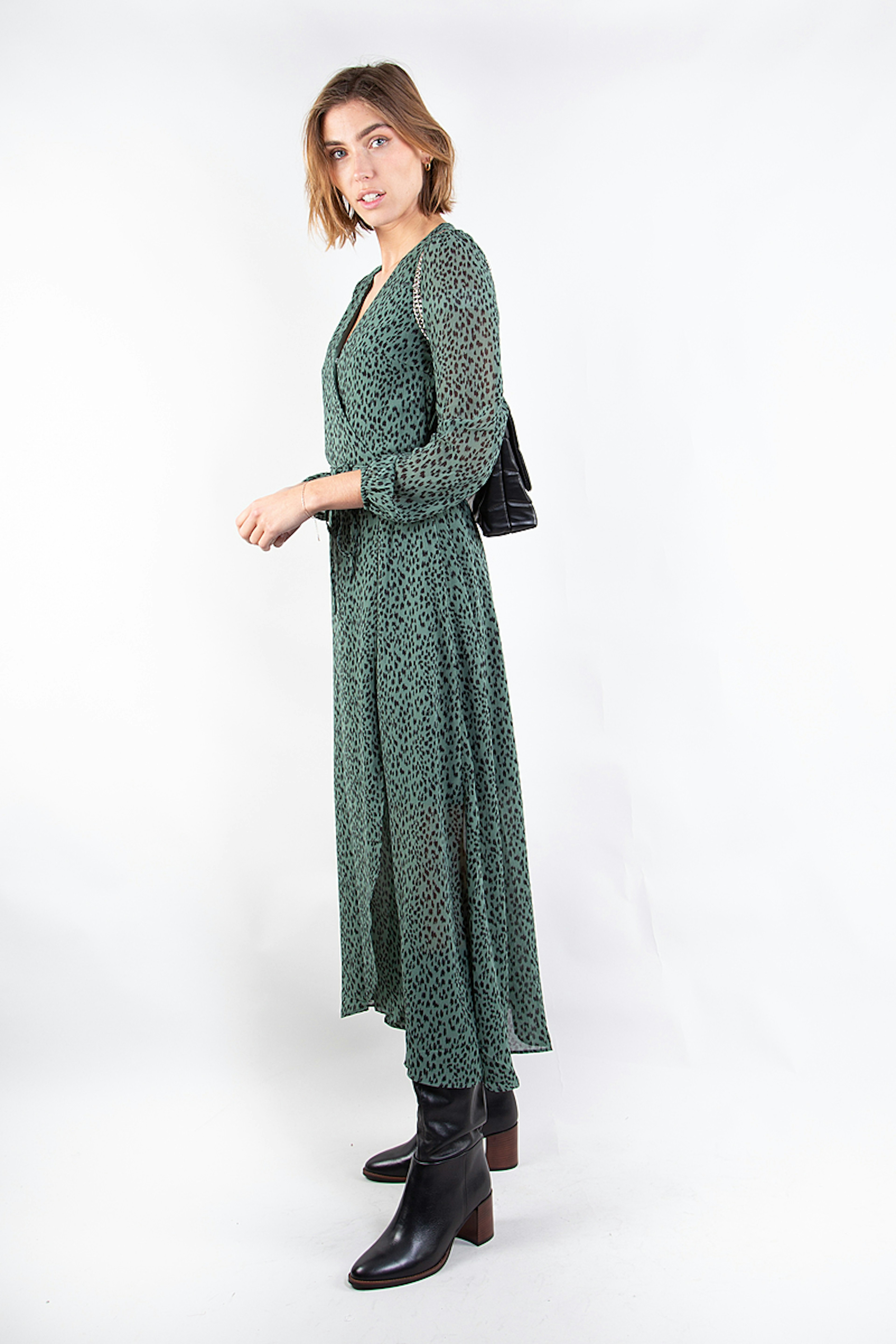 โข Robe longue ร manches longues coupe portefeuille โข Col V โข Tissu fluide satinรฉ vert imprimรฉ tachetรฉ noir โข A porter en journรฉe avec une veste en jean oversize et des boots rock et en soirรฉe avec une paire d'escarpins