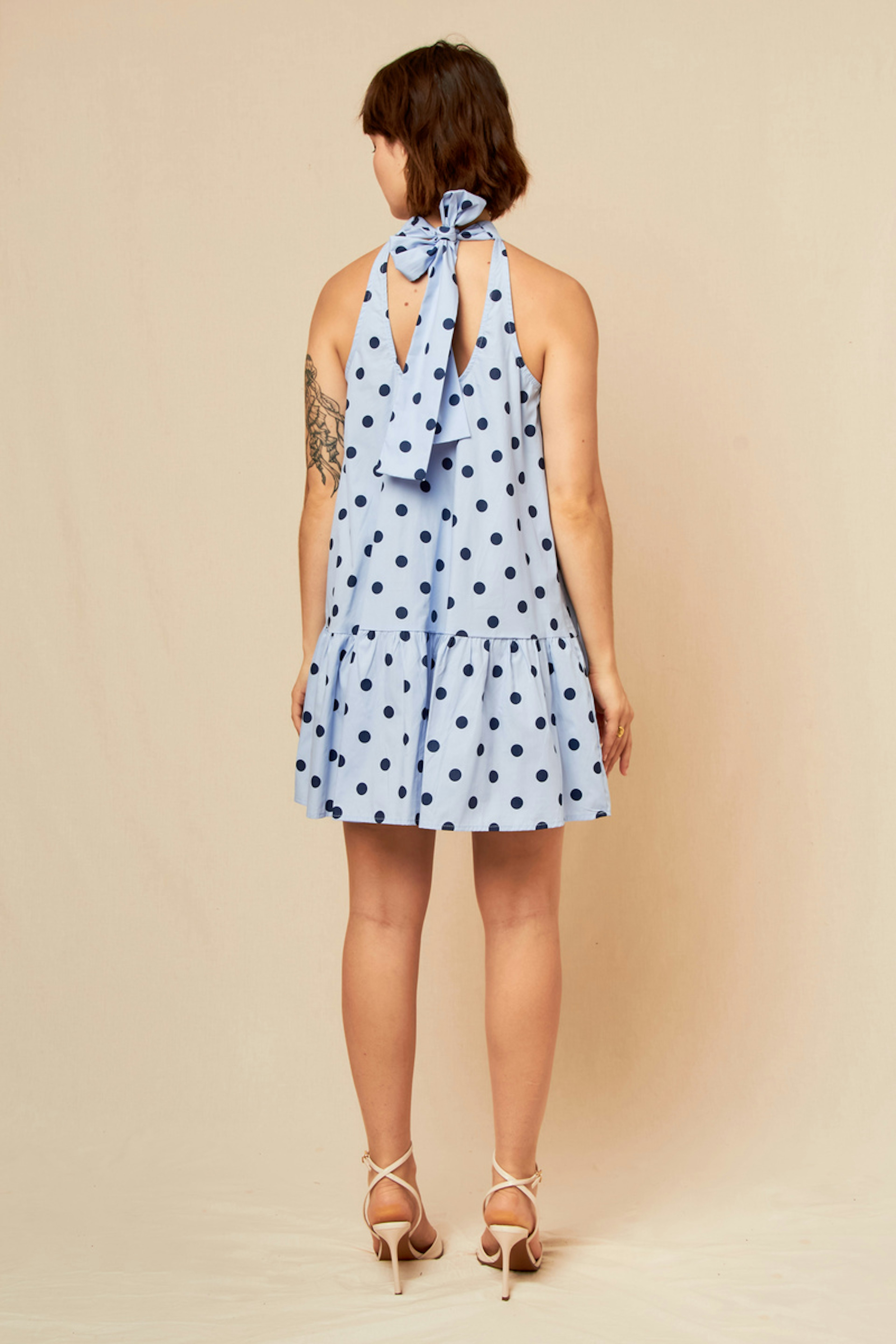 Associez cette robe à pois avec des sandales en cuir et une pochette tissée pour un été chic. • Robe courte en coton • Col licou • Coupe ample • Ourlet volanté • Motif à pois