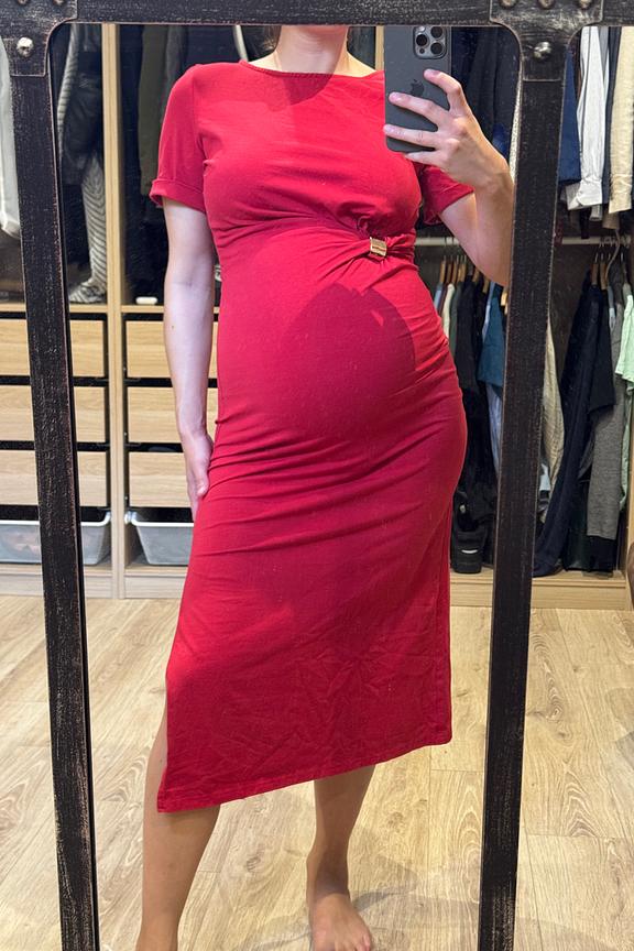 Associez cette robe rouge ร une paire de sandales dorรฉes pour une allure estivale รฉclatante. โข Robe droite โข Manches courtes โข Dรฉtail nouรฉ ร la taille โข Fente discrรจte โข Matiรจre en coton et รฉlasthanne