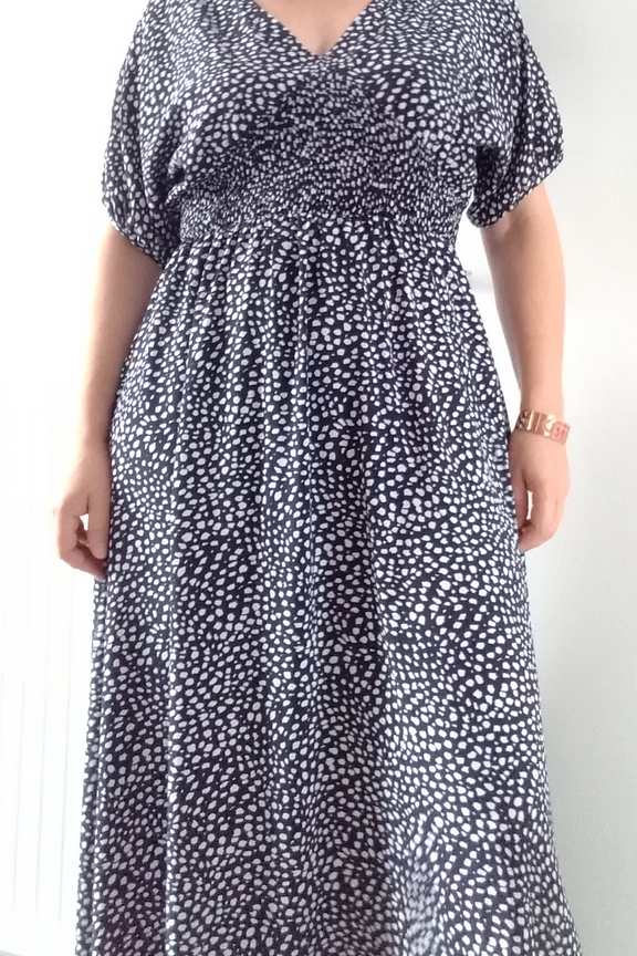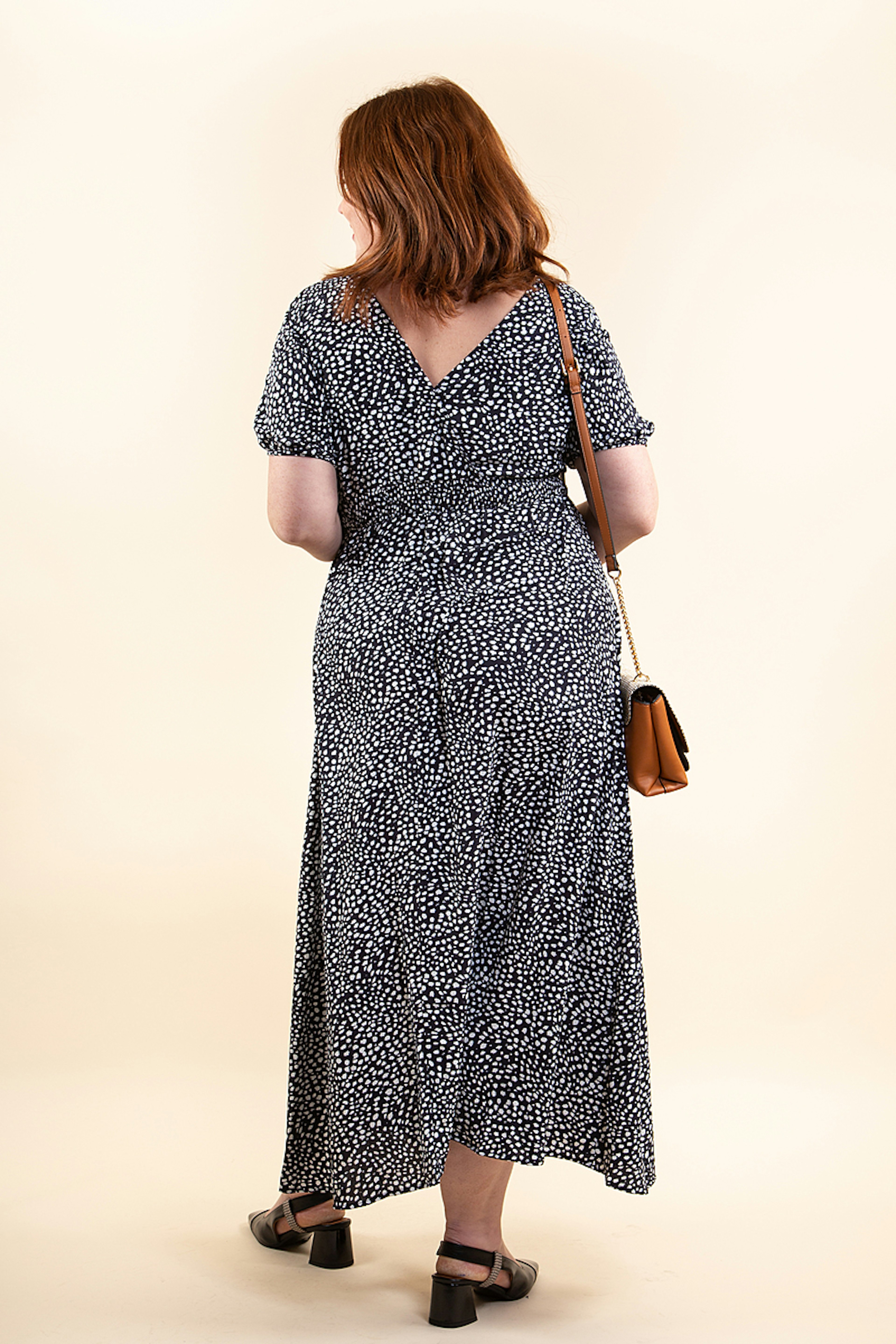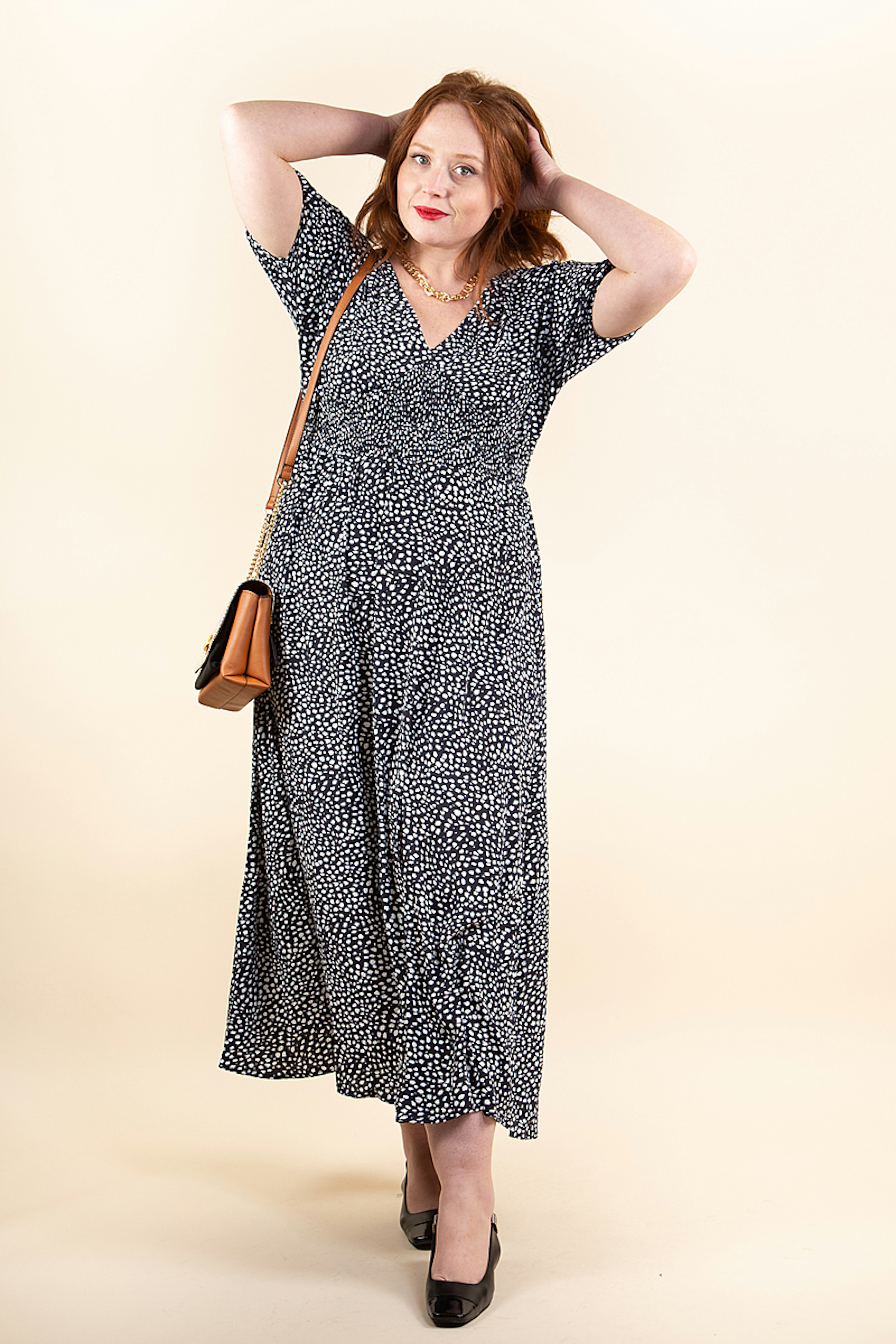 โ€œRobe trรจs longue (jusqu'aux chevilles pour mon 1,63m) fluide, qui suit les courbes du corps sans les marquer. L'empiรจcement smockรฉ en pointe au niveau de la taille peut รชtre seyant, mais pour ma morpho il remonte trop haut. Le tissu a tendance ร  gรฉnรฉrer de l'รฉlectricitรฉ statique.โ€