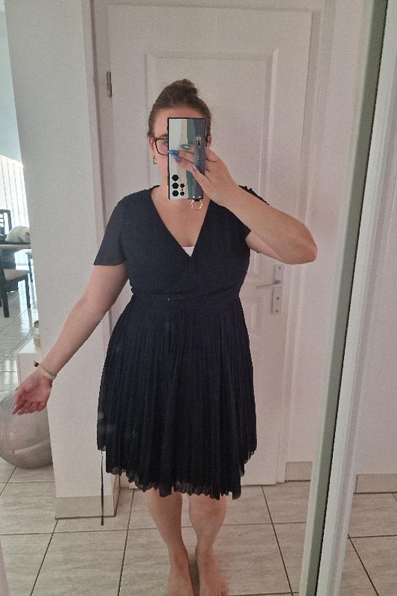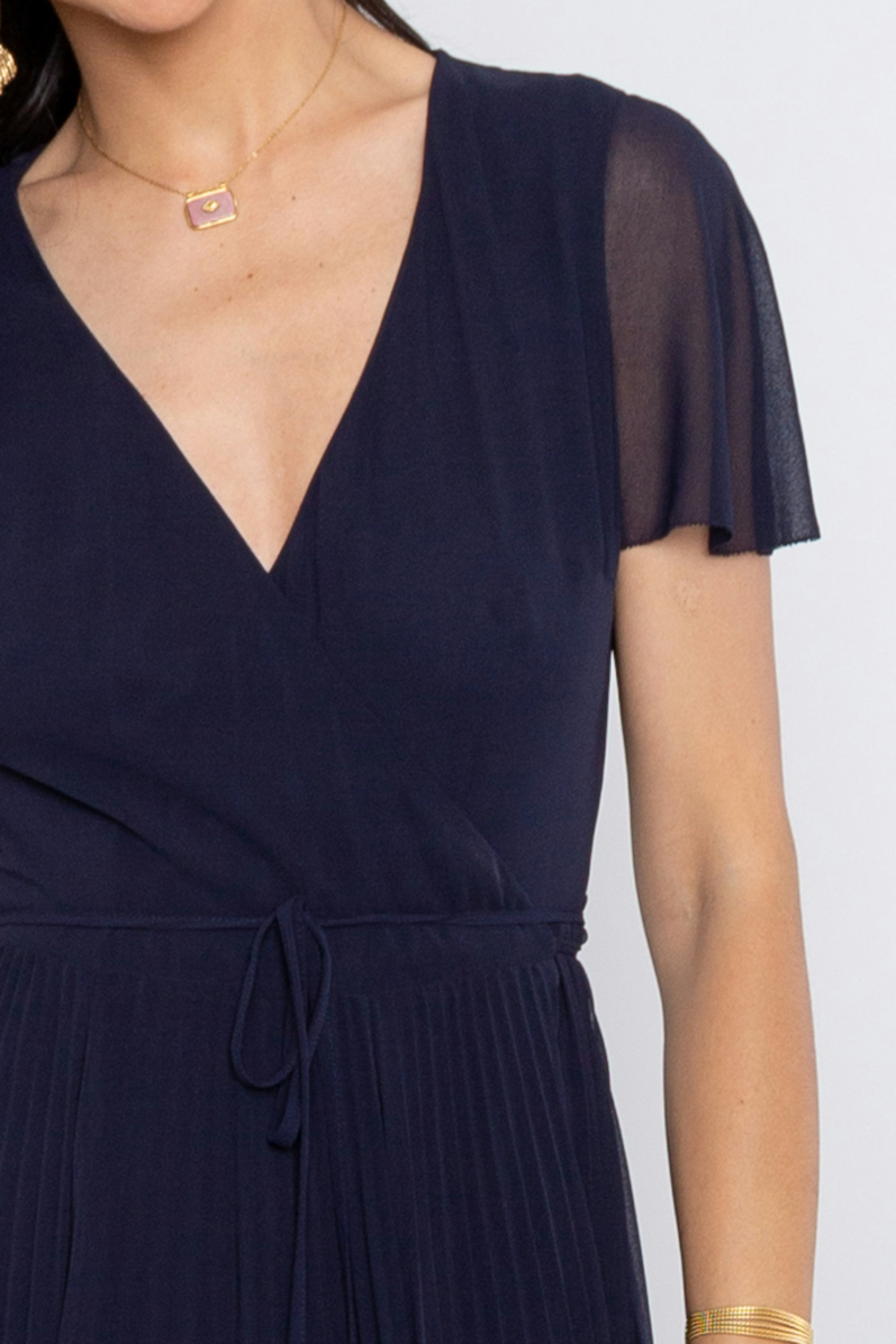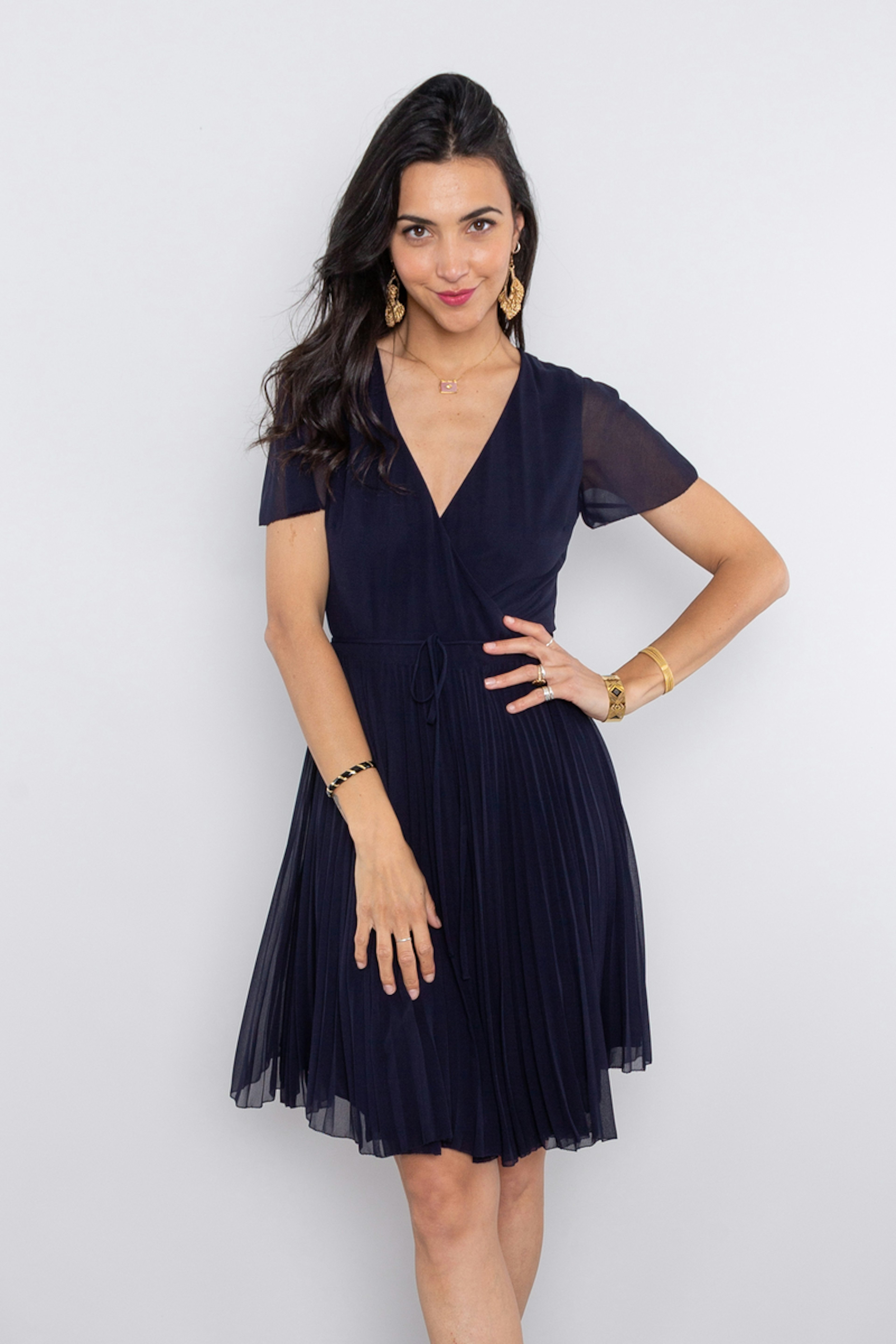 โข Robe courte ร manches courtes bleue marine โข Forme portefeuille avec lien ร nouer โข Longueur au-dessus du genou