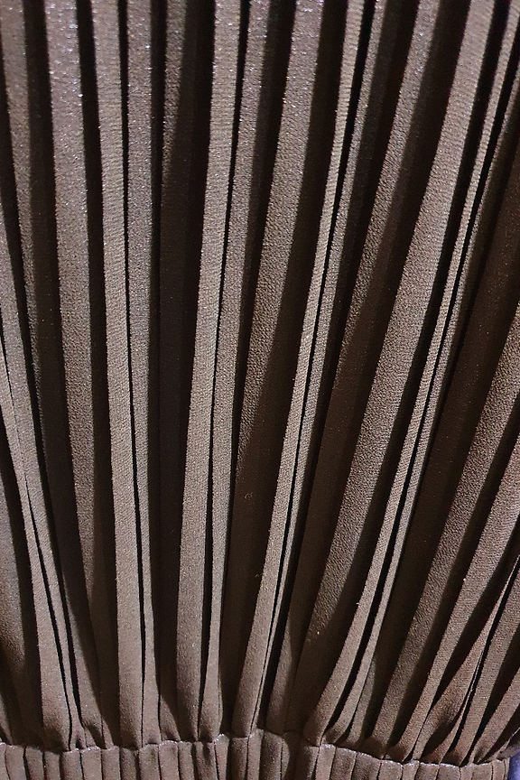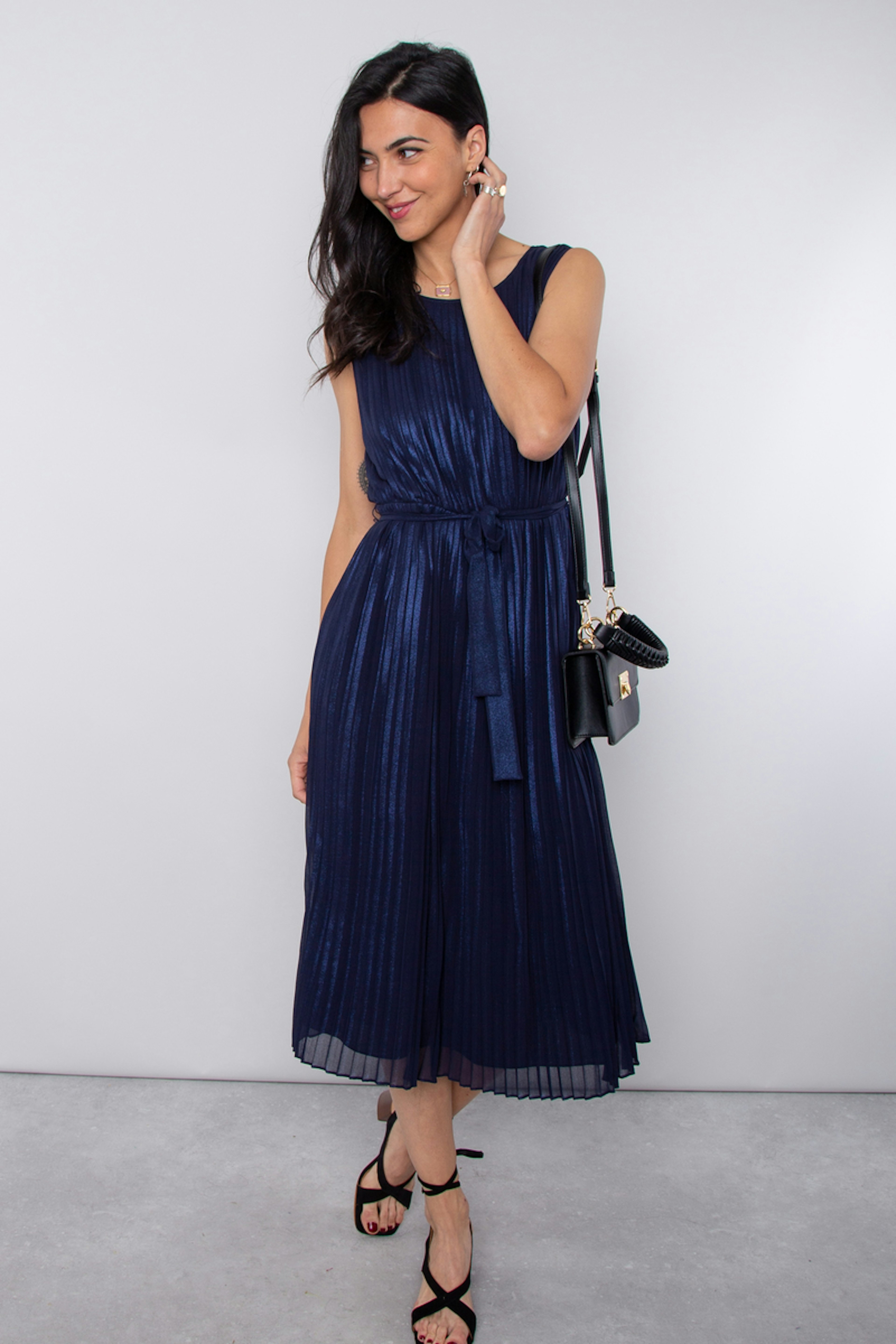 โข Robe sans manches plissรฉe bleue โข Matiรจre effet mรฉtallisรฉ โข Longueur genou โข Taille cintrรฉe