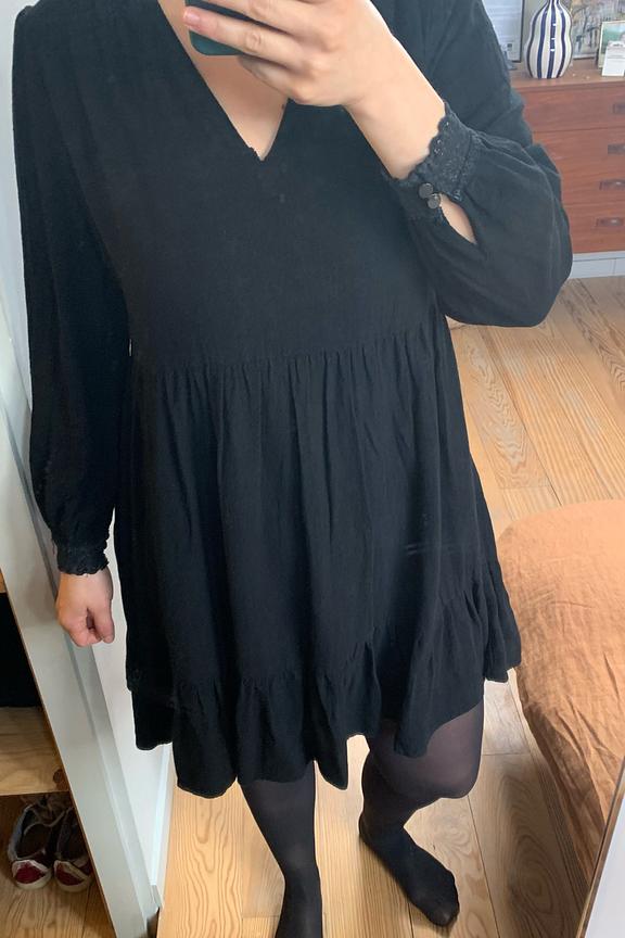 โข Robe droite courte unie noire โข Manches longues avec dรฉtails de dentelle aux manches โข Col V