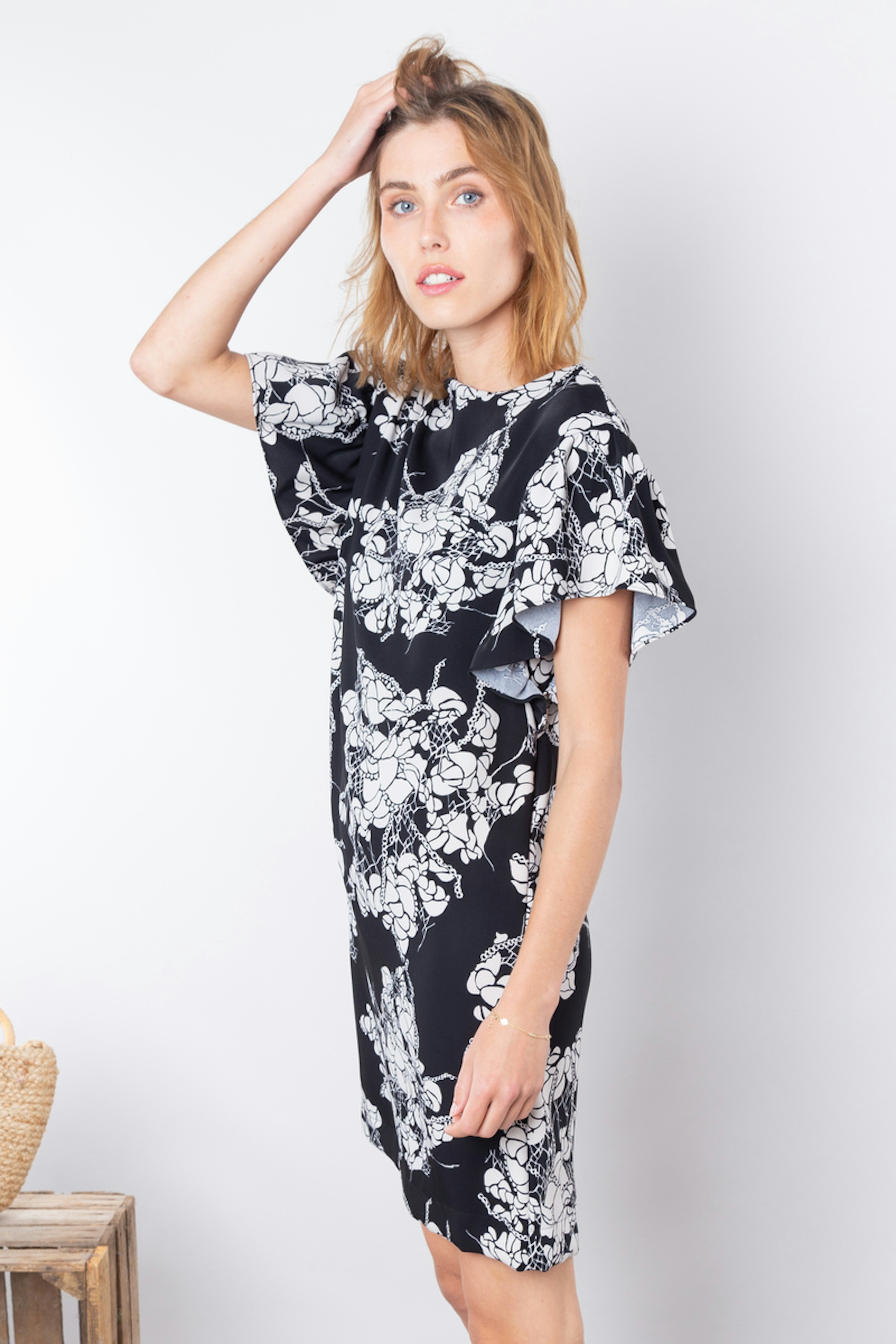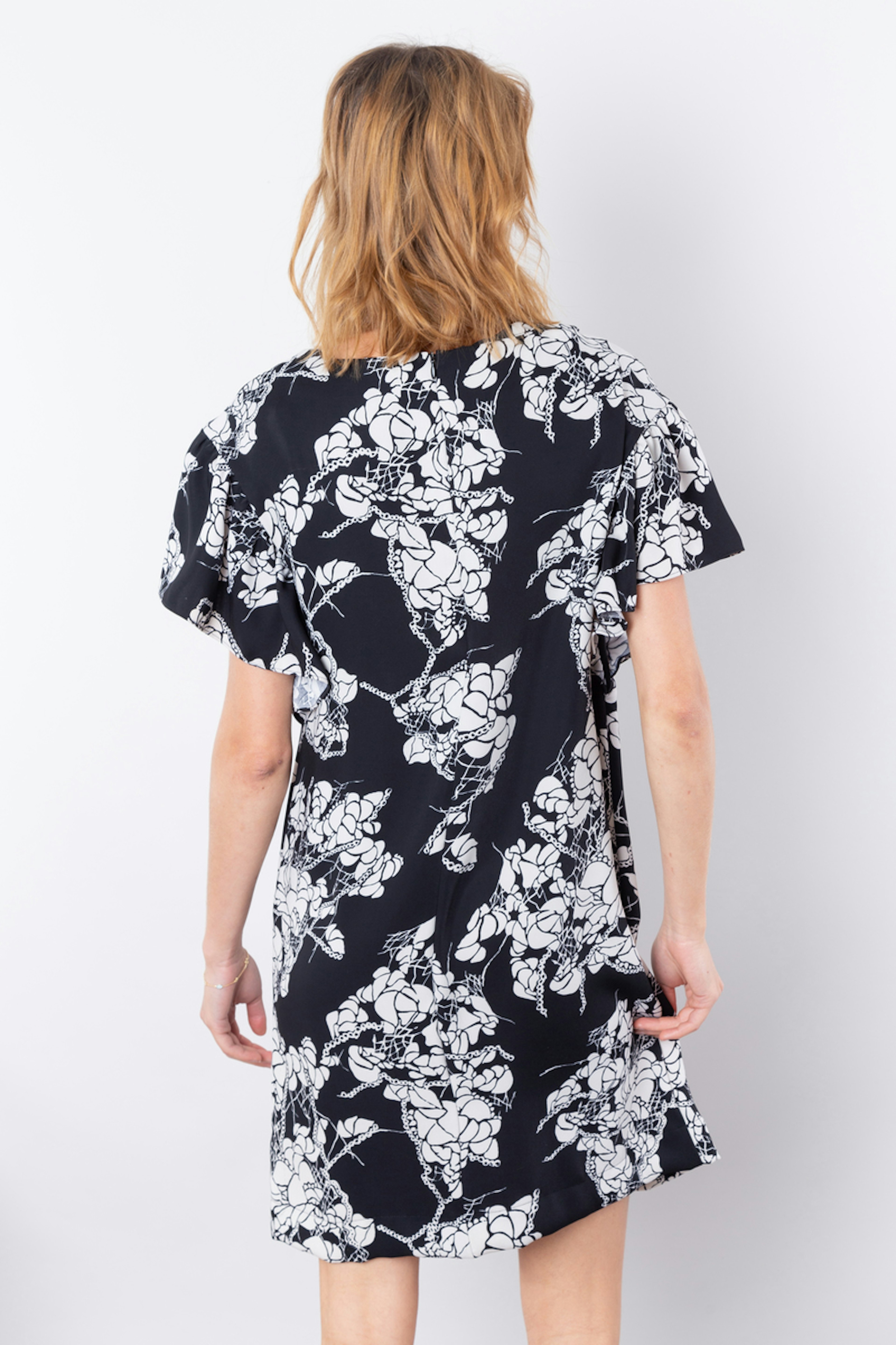 โข Robe noire courte ร imprimรฉs fleuris blancs โข Col rond โข Manches courtes รฉvasรฉes en forme de cloche โข Coupe droite โข Fermeture zippรฉe dans le dos