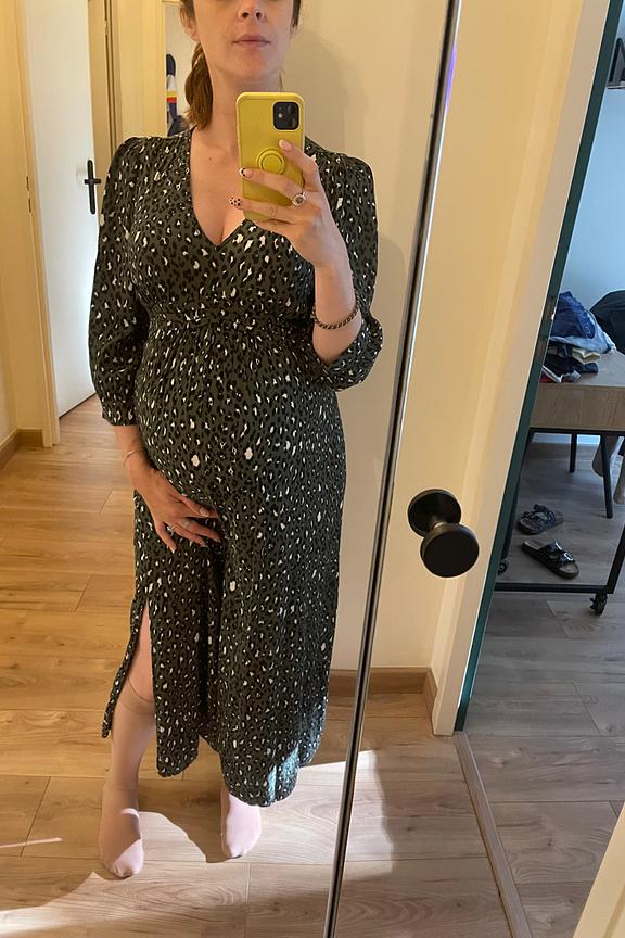 Optez pour un look chic avec cette robe et des bottines noires, idéale pour un style intemporel et élégant. Parfait en toute saison. • Robe maternité • Décolleté en V • Manches mi-longues • Motif imprimé • Fente discrète