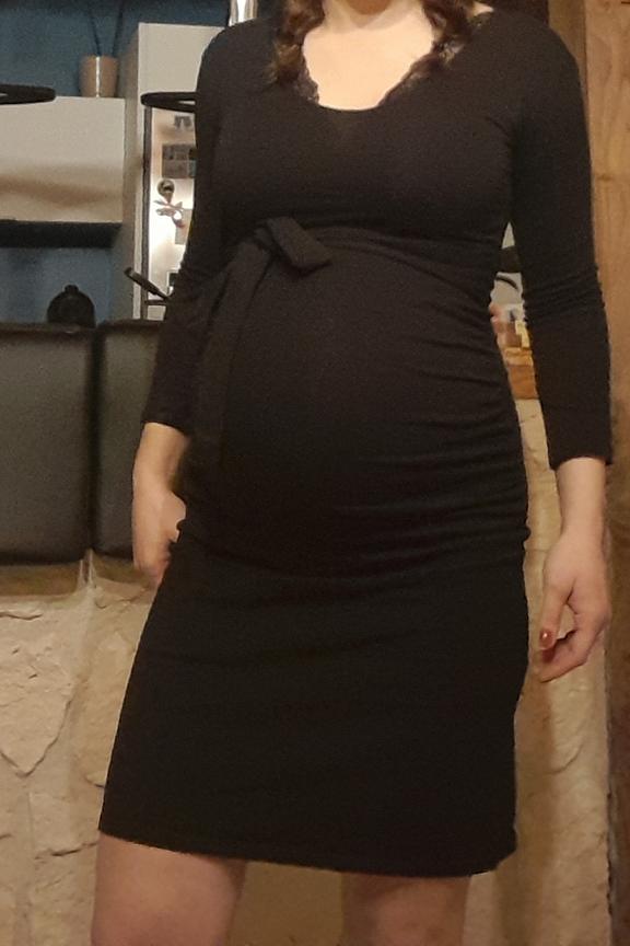 โข Robe noire courte โข matiรจre extensible, drapรฉ, ceinture, รฉlรฉgante โข Dรฉcoletรฉ rond en V