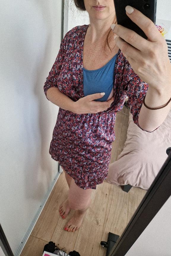 “Robe fluide idéale pour l'allaitement. Tissu bleu invisible en doublure. Un peu courte pour mon 1m75”