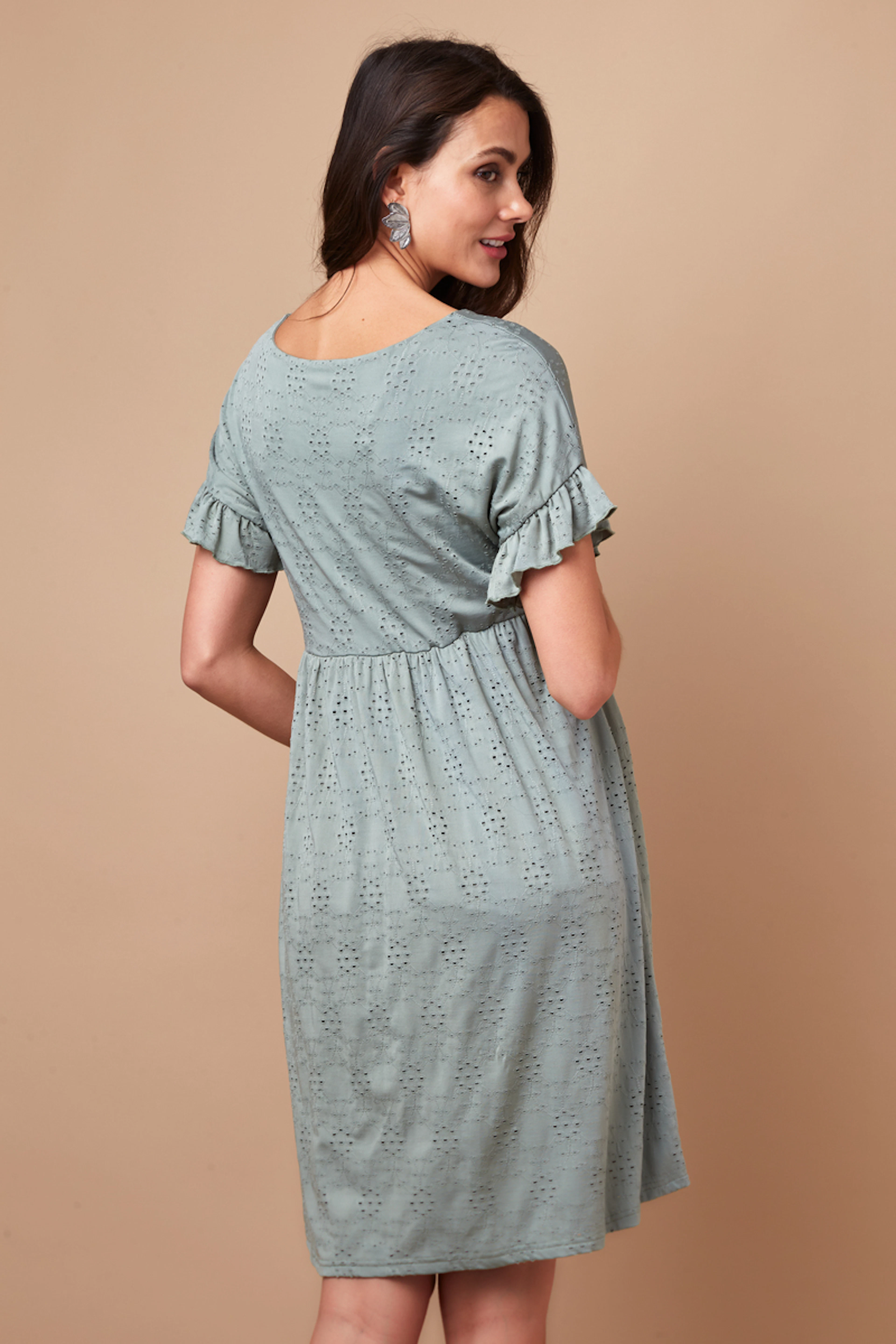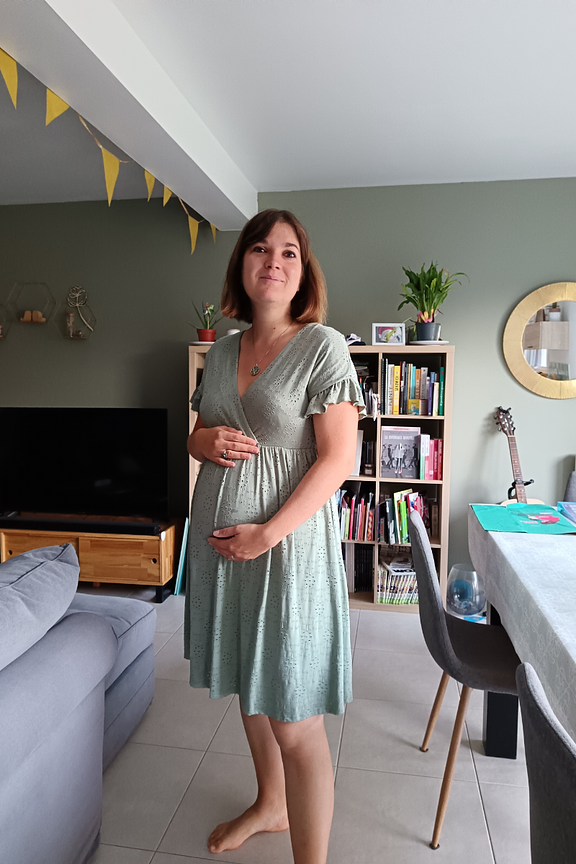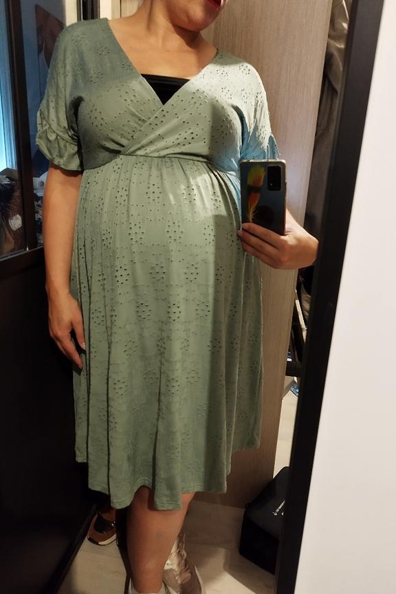 Soyez l'incarnation de la grâce estivale avec cette robe légère, parfaite pour flâner sous le soleil ou pour une douce soirée d'été. Associez-la à des sandales plates pour un look décontracté. • Robe fluide maternité • Manches courtes volantées • Motif brodé ton sur ton