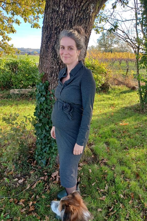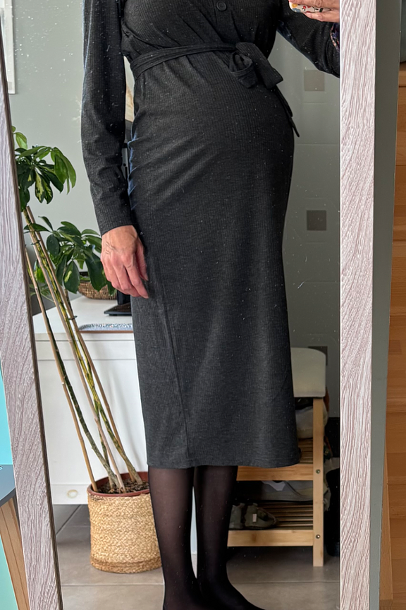 “Je fais du S/M et le M taille un peu grand. Ça va sur la fin de grossesse. Sinon le modèle est très sympa ça fait une jolie silhouette avec la ceinture qui marque la taille.”