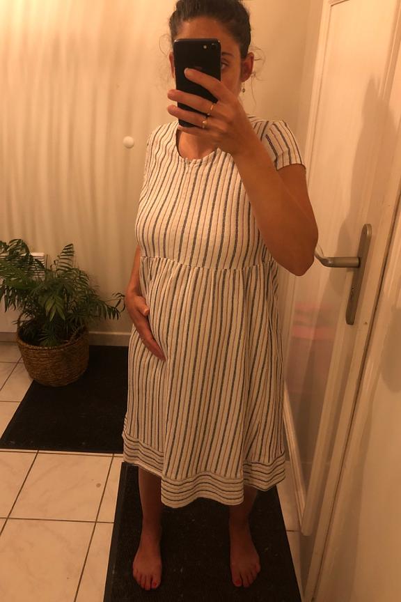 โRobe trรจs agrรฉable, bien taillรฉe. Je prรฉfรฉrerais juste le dรฉcolletรฉ lorsque la fermeture pratique pour l'allaitement รฉtait ouverte (moins haute et col rond). Bien adaptรฉ pour mon ventre de de 9 mois. Robe pas trop courte qui arrive au dessus des genoux pour ma taille (1,70m).โ