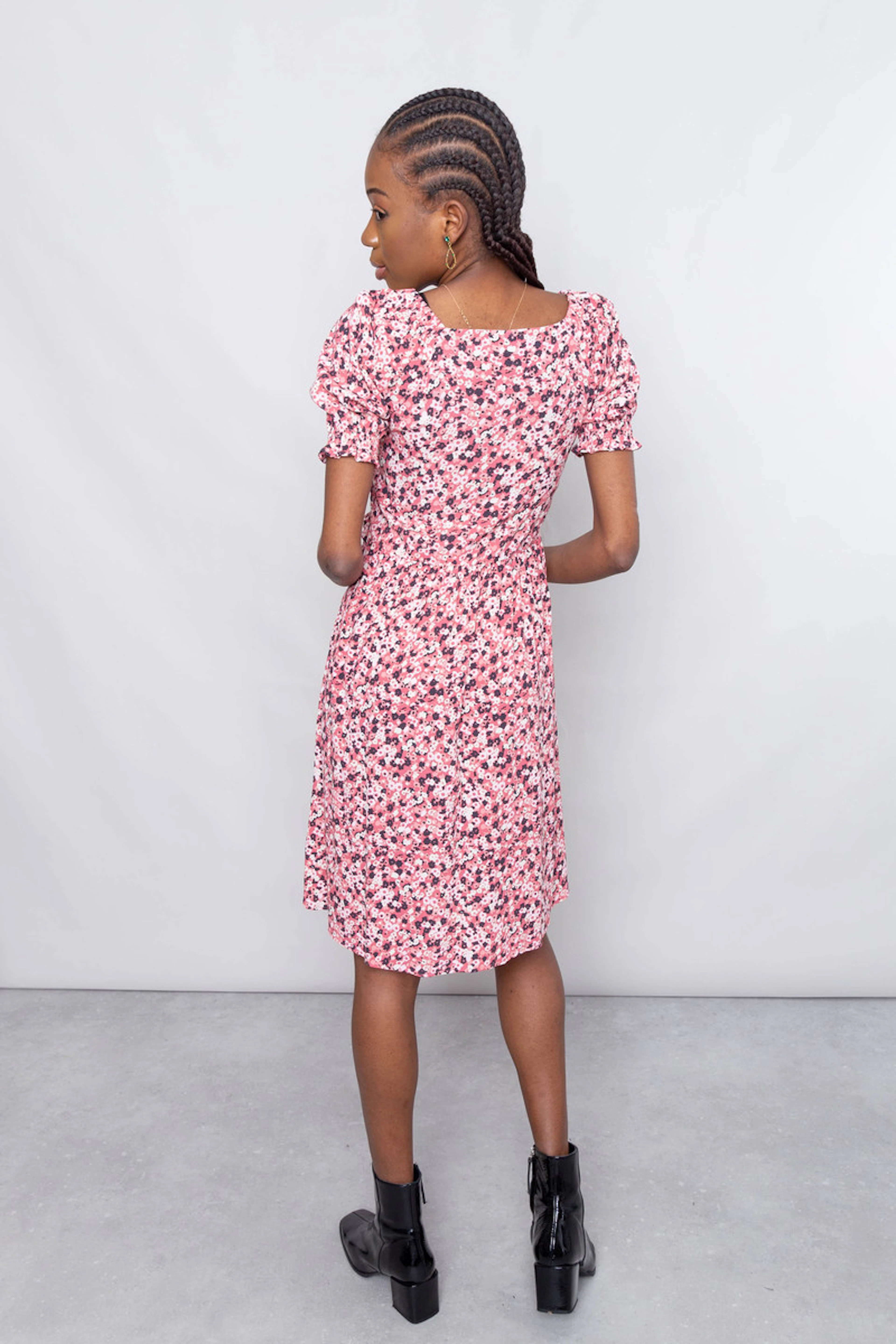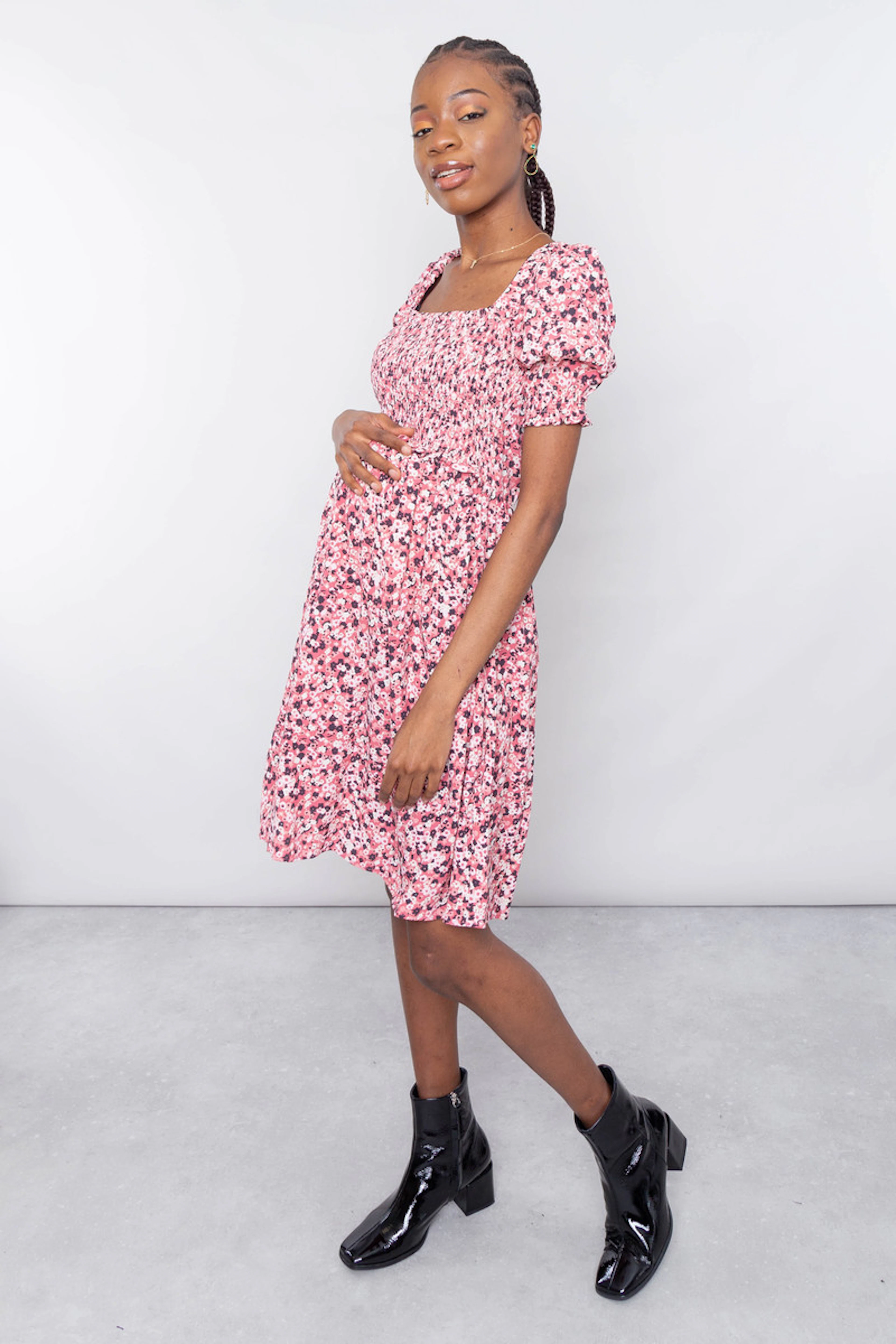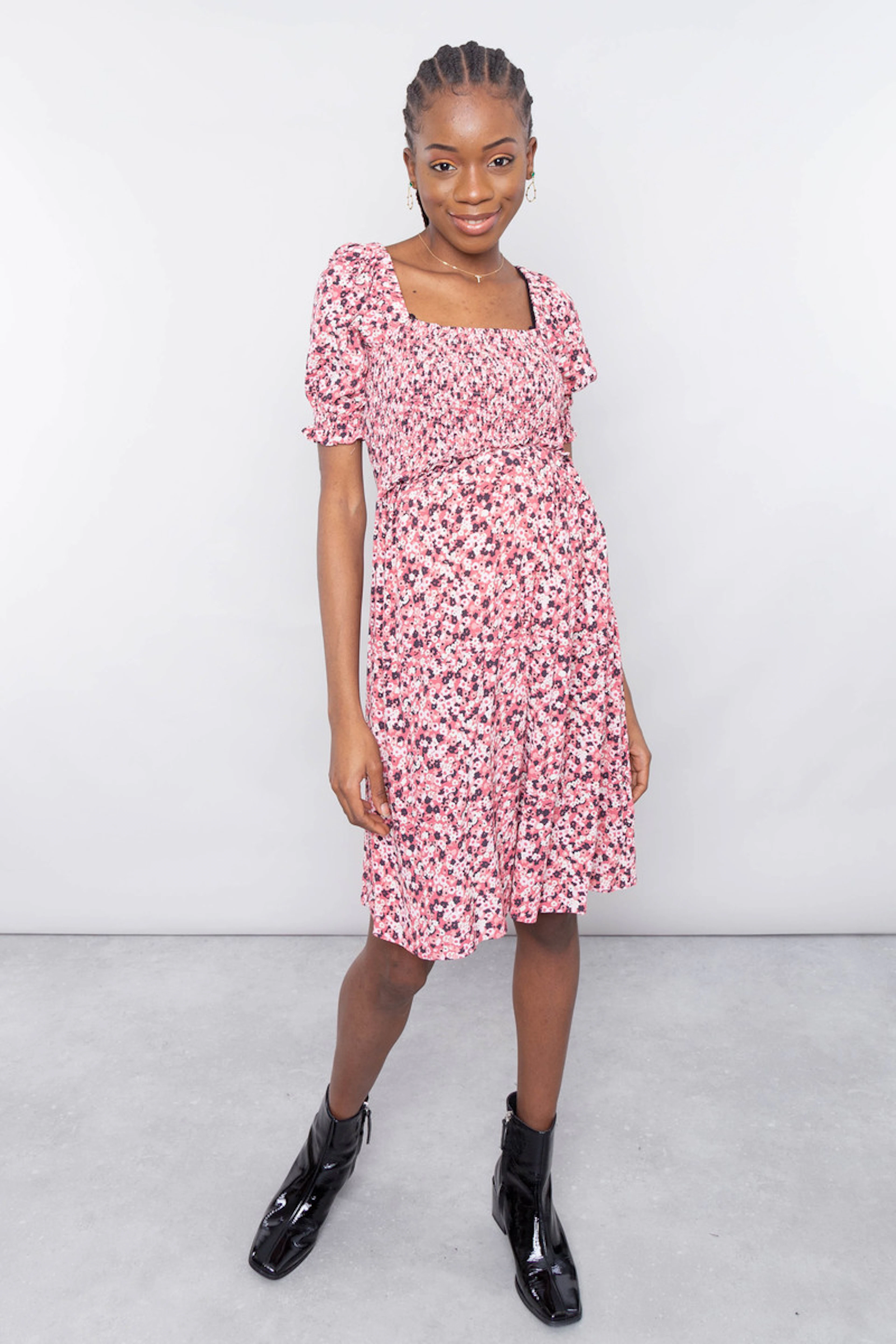 • Robe de grossesse et d'allaitement rose • Imprimé fleuri • Smocks au niveau de la poitrine • Manches courtes ballons • Accès facile et discret à l'allaitement