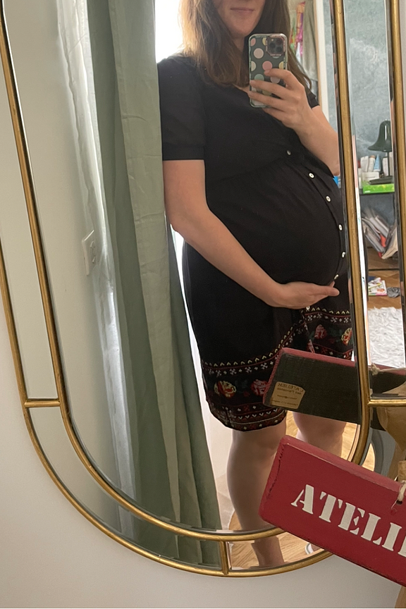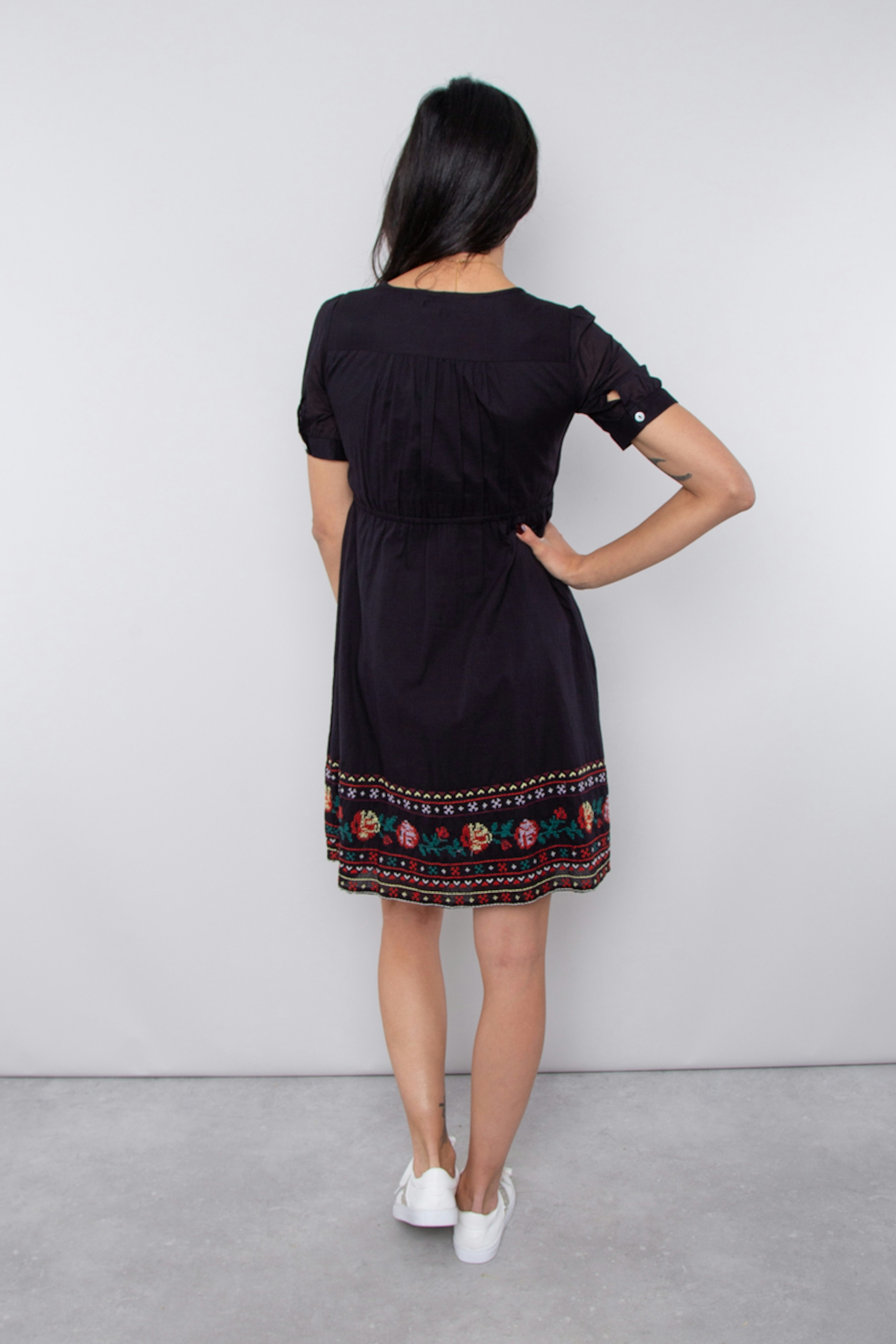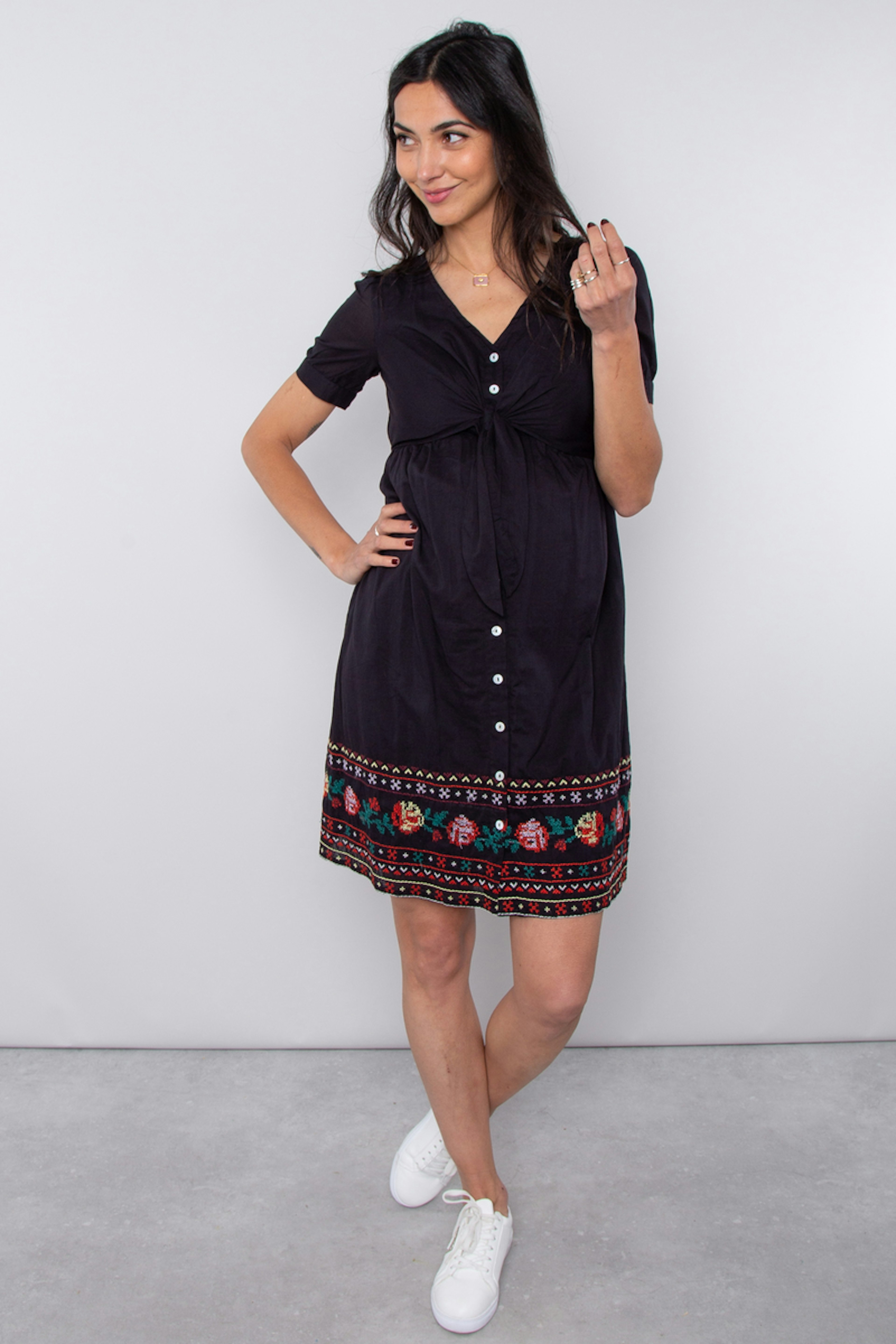 โข Robe de grossesse noire avec broderies โข Noeud double รฉpaisseur sur le devant pour un allaitement discret โข Ourlet brodรฉ de fleurs de style folklorique โข Dรฉboutonne sur toute la longueur โข Manches courtes avec revers โข Col en V โข Longueur au-dessus du genou