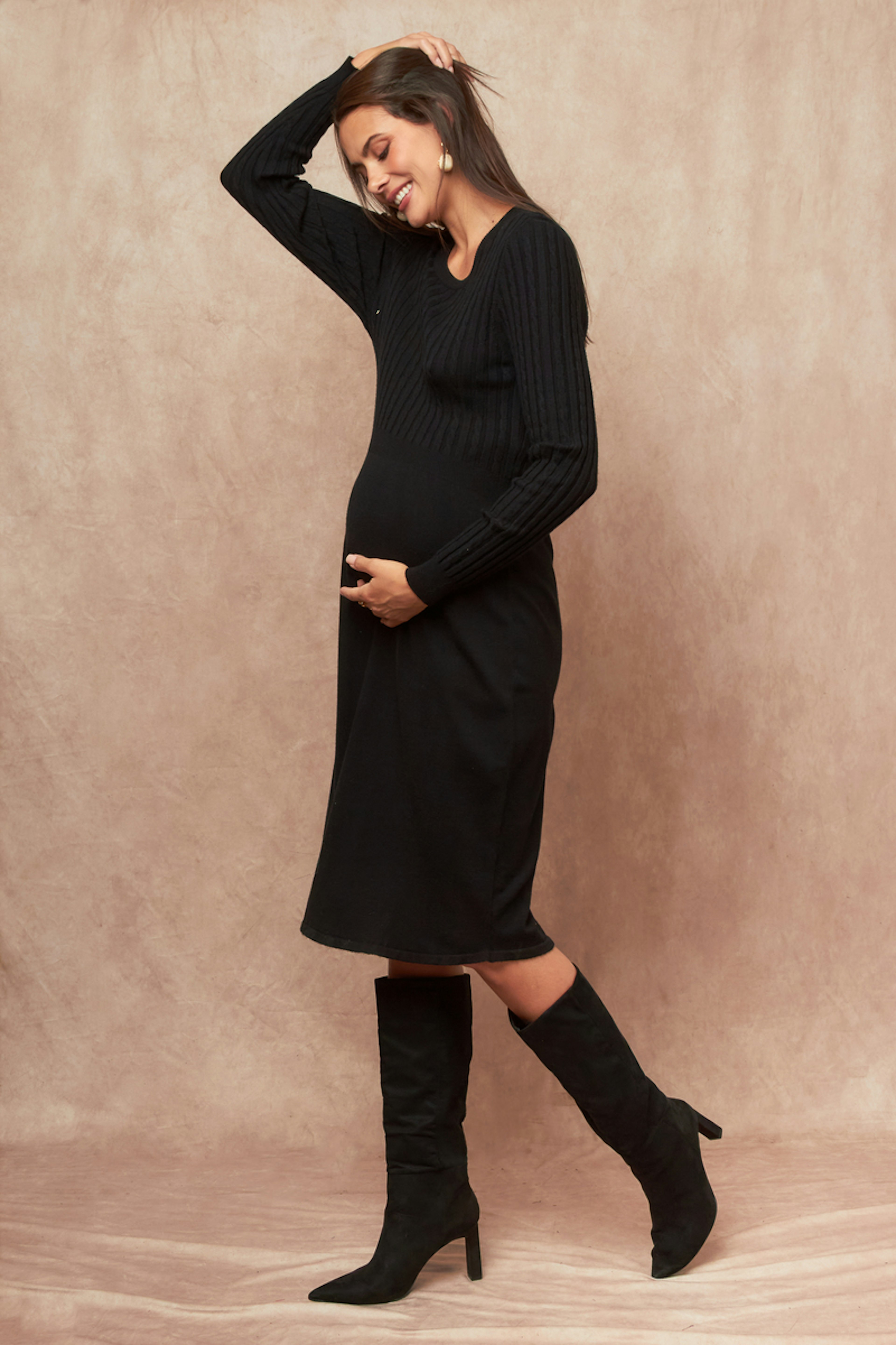 Ajoutez une touche d'élégance avec cette robe noire, parfaite avec des bottes en cuir et un manteau douillet pour l'hiver. • Robe en maille côtelée • Coupe ajustée • Manches longues • Encolure ronde • Ourlet légèrement évasé