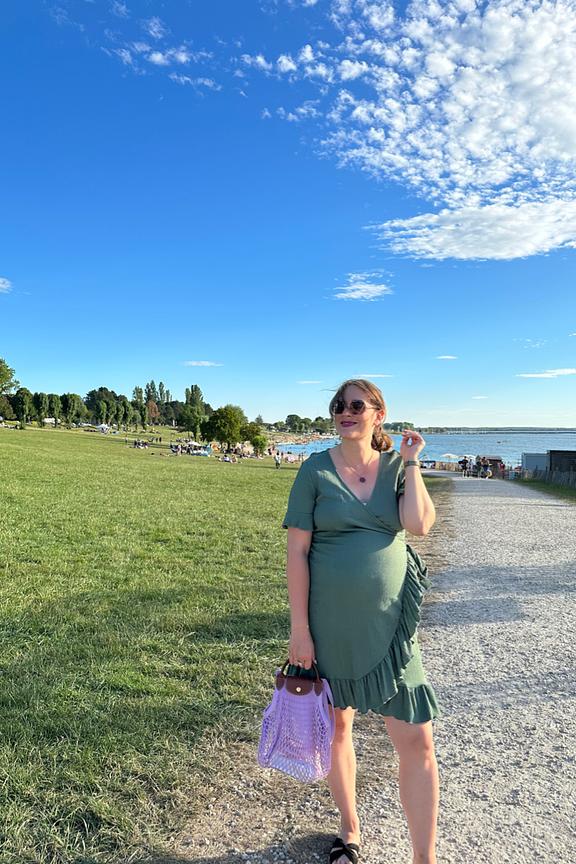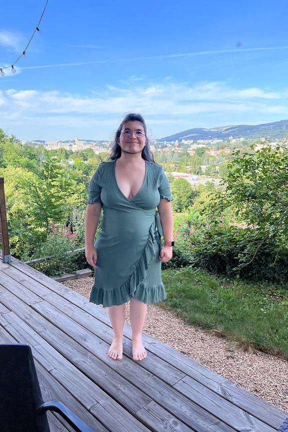 โCharmante robe, portรฉe durant le 9e mois. Prendre une taille supplรฉmentaire afin d'รชtre plus ร l'aise, j'ai รฉgalement portรฉ la robe avec une รฉpingle ร nourrice dans le dรฉcolletรฉ, mais avec cela elle est ravissante et agrรฉable ร porter.โ