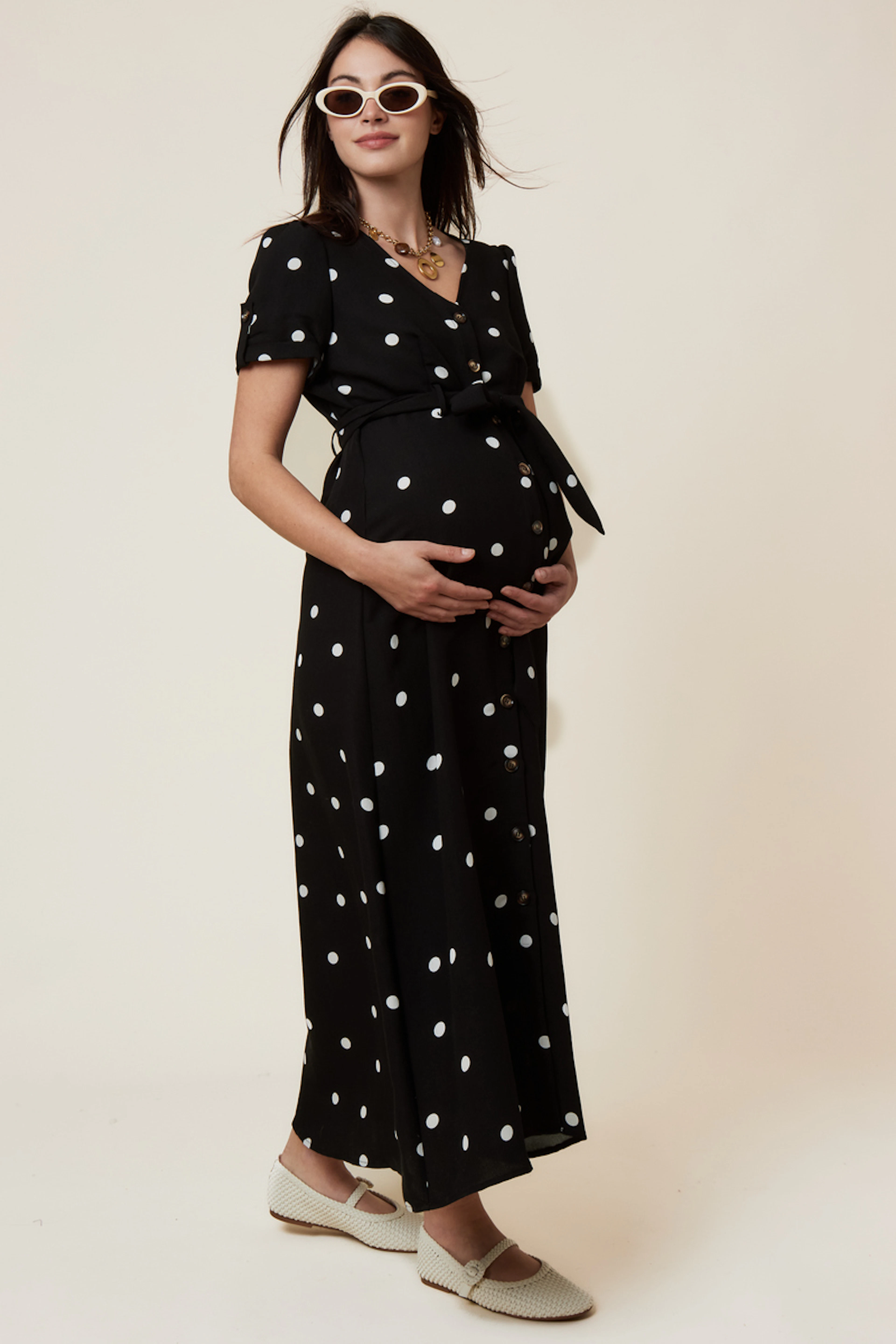 Associez cette robe à imprimé avec des sandales élégantes et un chapeau à larges bords pour une allure été chic et confortable. • Robe longue • Ceinture à nouer • Manches courtes • Imprimé à pois • Boutonnage avant
