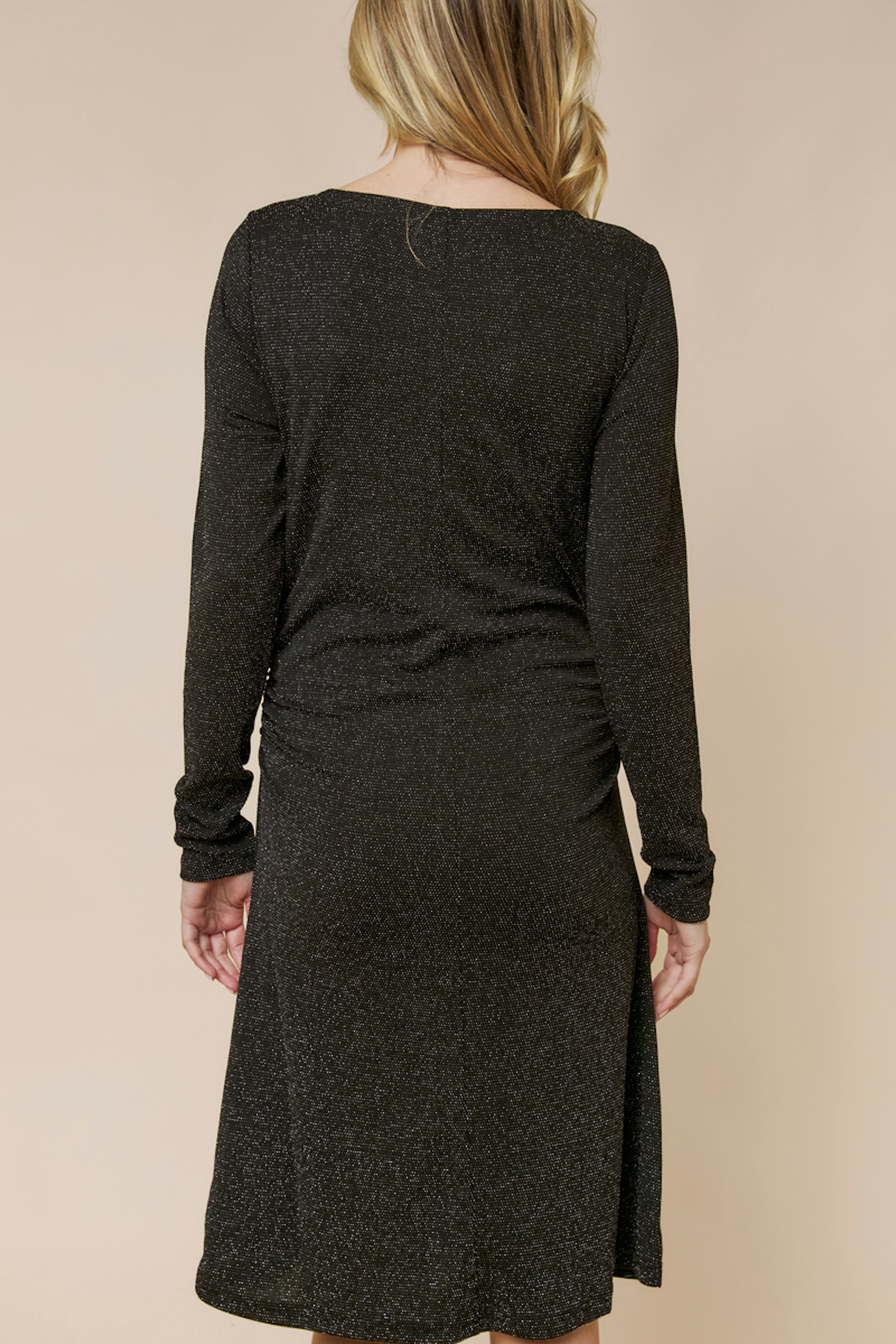 Associez cette robe chic à des bottines et une écharpe en laine pour une allure raffinée lors des fraîches journées d'hiver. • Robe droite • Manches longues • Col rond • Coupe près du corps • Tissu métallisé