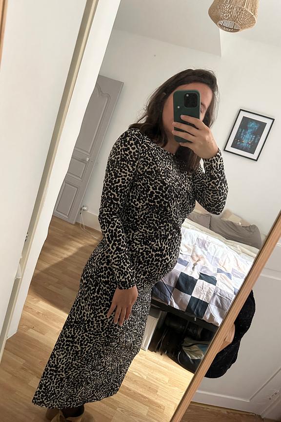 “Coupe un peu bizarre avec une ligne qui arrive au milieu du ventre. Mais une fois portée cela se voit peu. Beaucoup de compliments avec cette robe !”