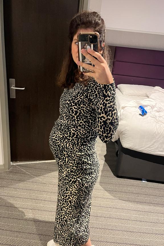 Portez cette robe avec des mocassins noirs pour un look élégant en toute circonstance. Parfait en toute saison. • Robe d'allaitement en coton • Taille ajustée et élastiquée • Manches longues • Dos nu croisé • Imprimé all over