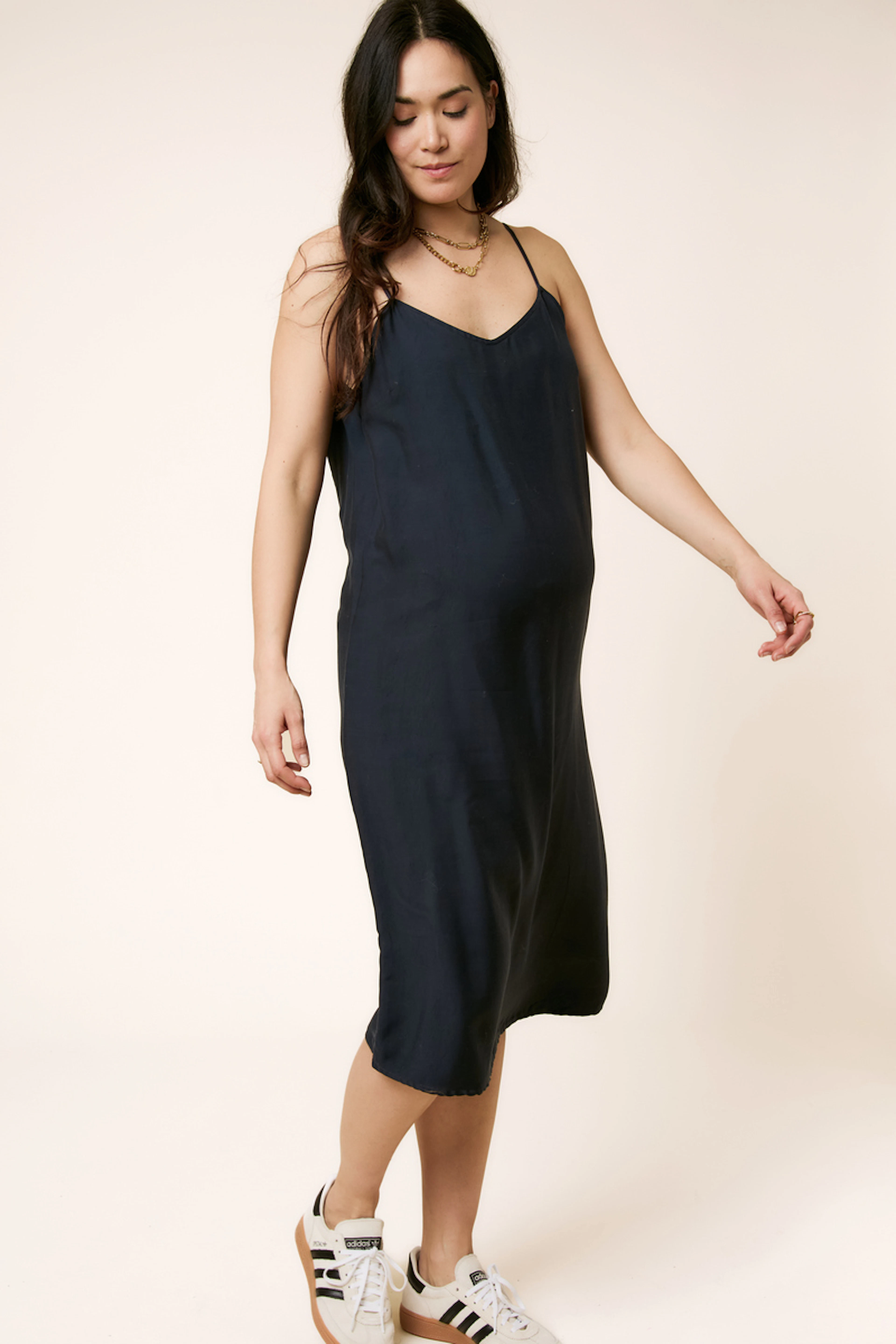 Ajoutez une veste en jean et des sandales pour un style chic et décontracté. • Robe en cupro • Coupe droite • Bretelles fines • Longueur midi • Parfaite pour la maternité