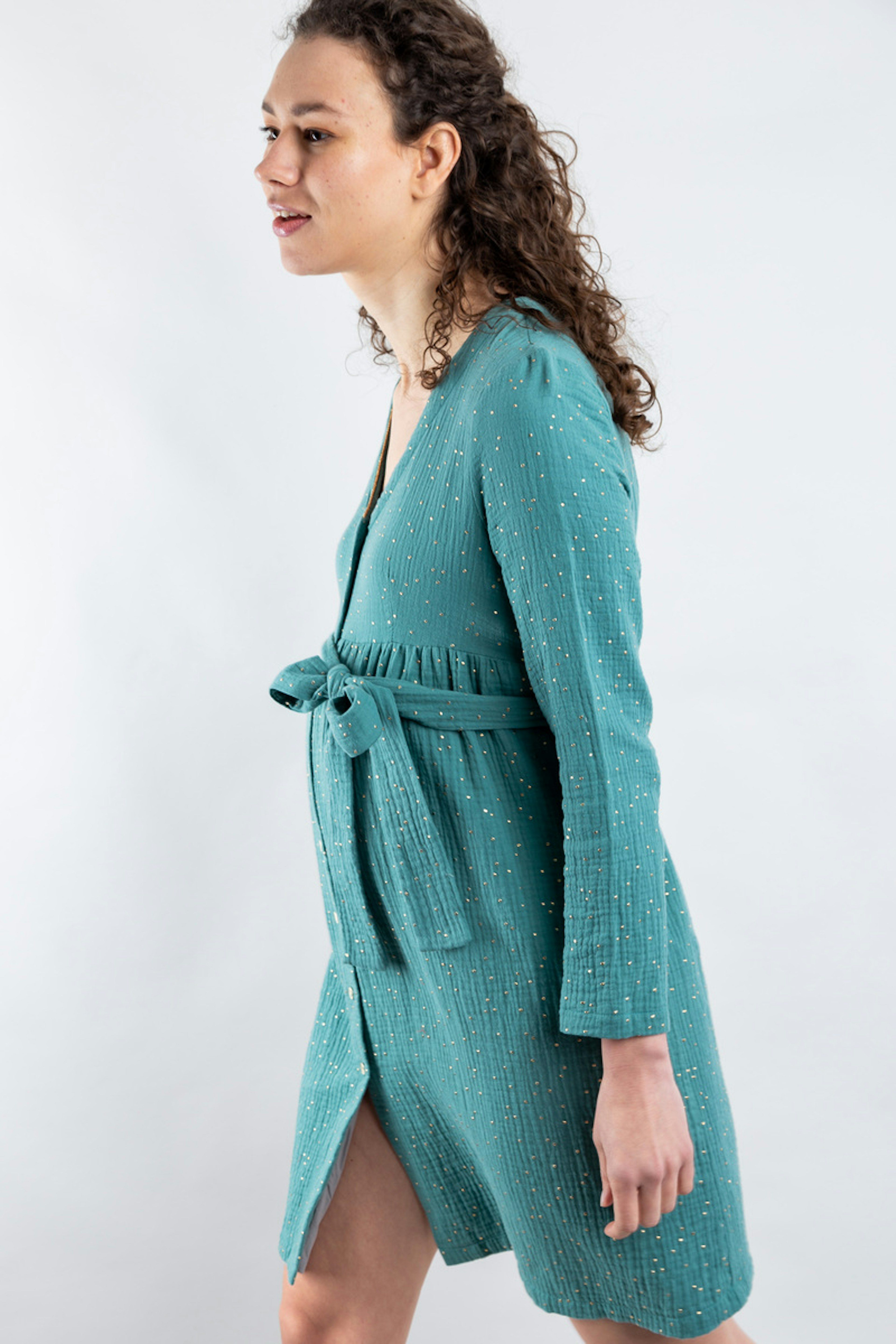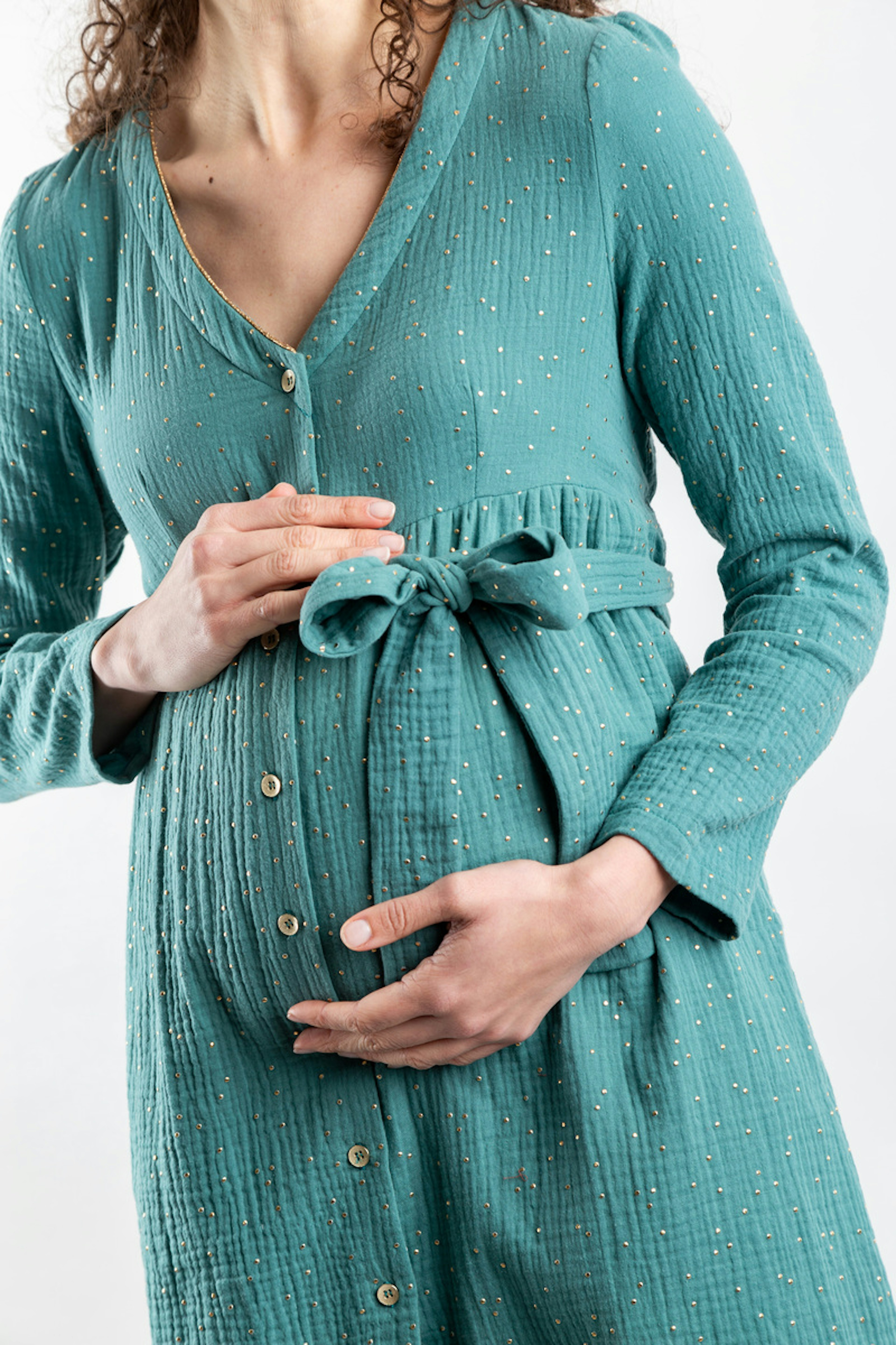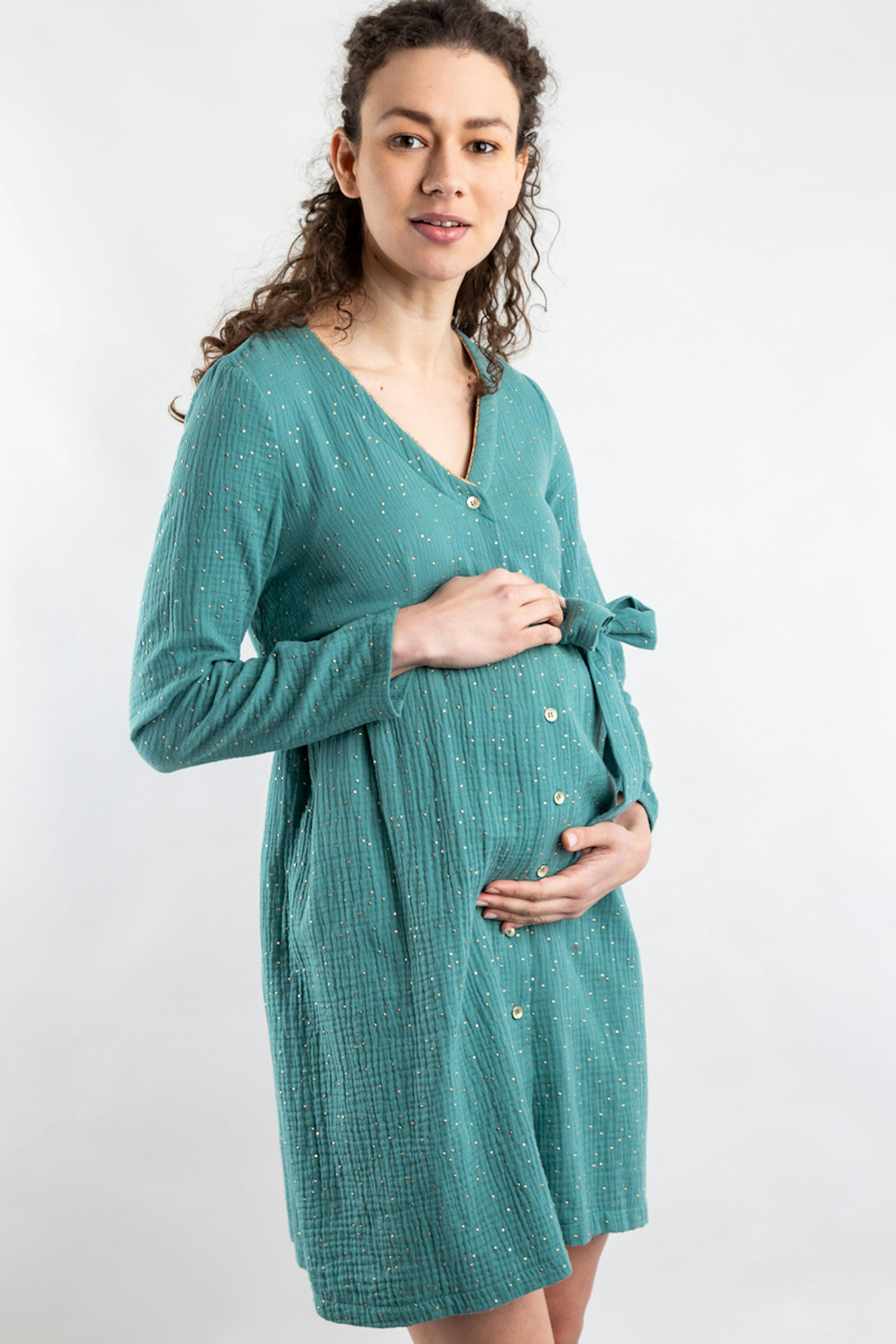 โข Robe de grossesse de couleur bleu โข Effet matiรจre gaz de coton โข Imprimรฉs ร pois dorรฉs โข Manches longues โข Col V โข Boutonnรฉe sur le devant โข Ceinture en tissu ton sur ton ร nouer ร la taille