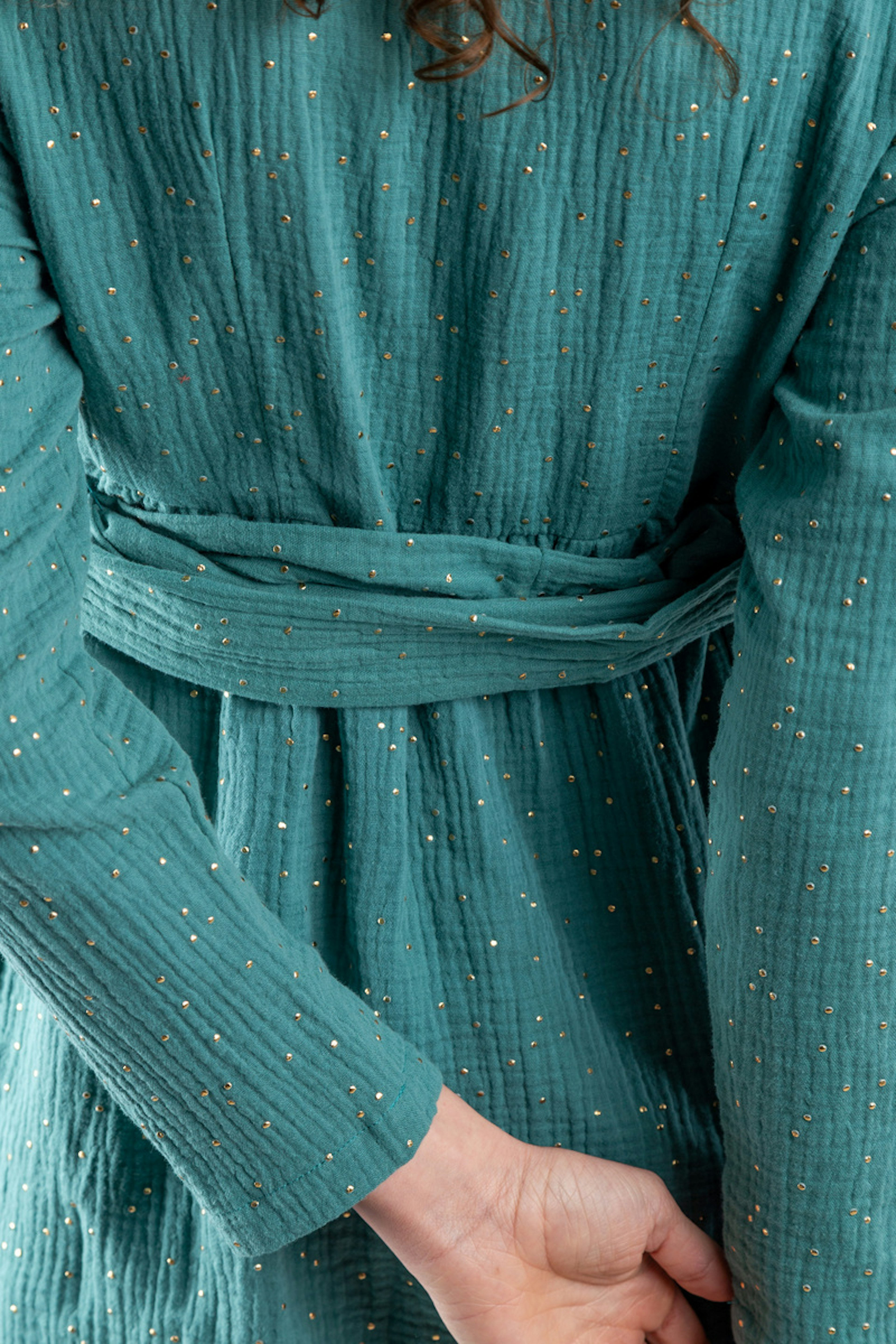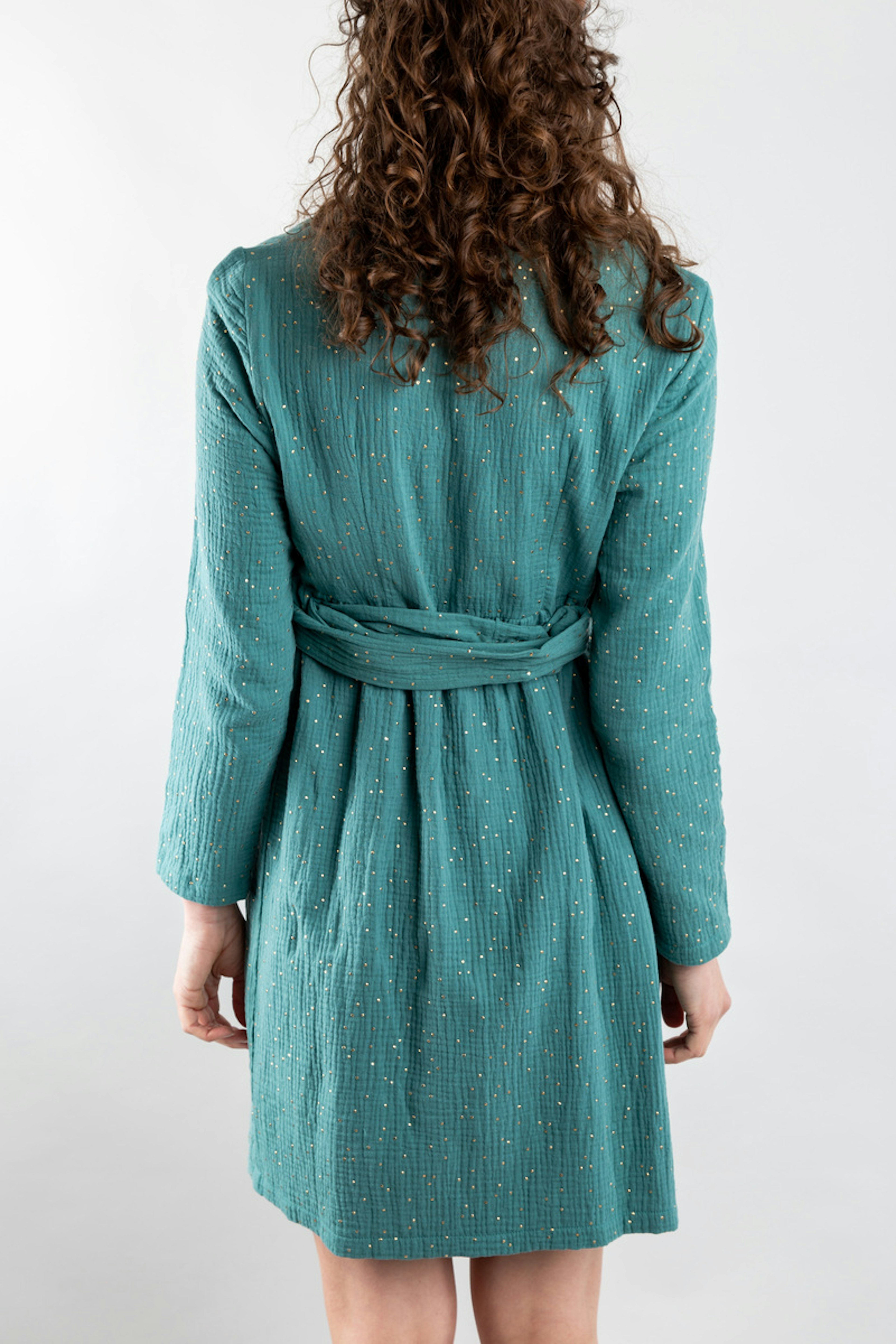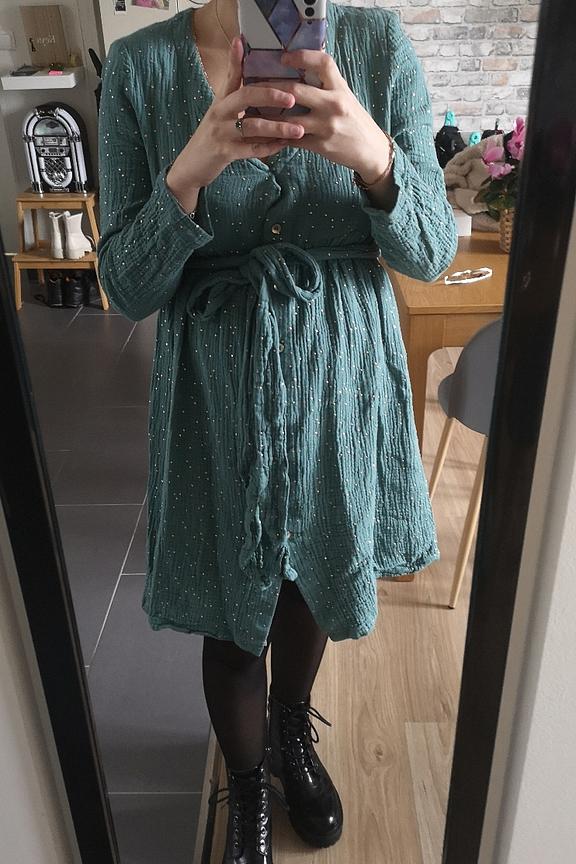 โข Robe de grossesse de couleur bleu โข Effet matiรจre gaz de coton โข Imprimรฉs ร pois dorรฉs โข Manches longues โข Col V โข Boutonnรฉe sur le devant โข Ceinture en tissu ton sur ton ร nouer ร la taille