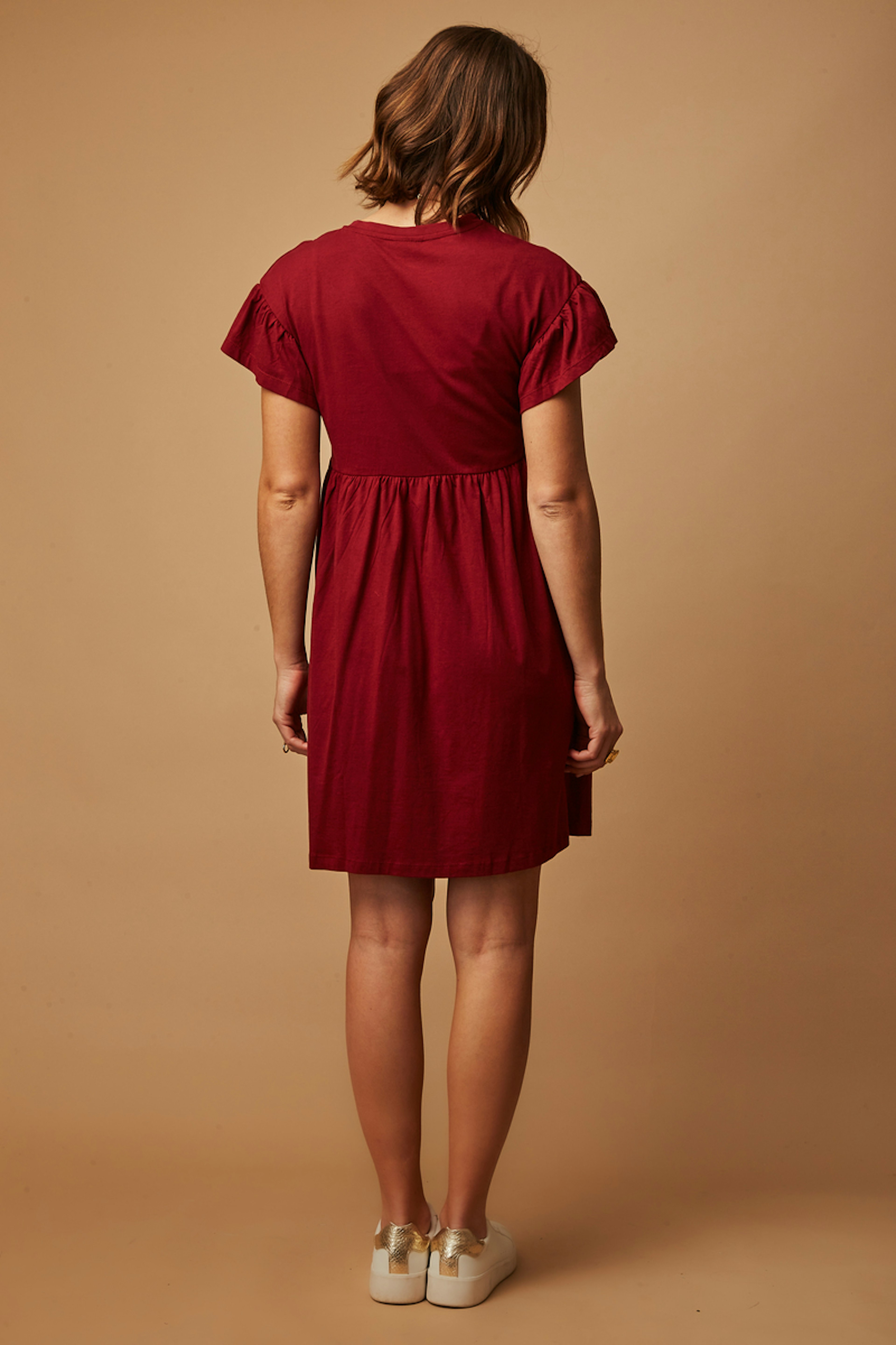 Craquez pour cette robe bordeaux parfaite pour une รฉlรฉgance quotidienne, รฉtรฉ comme hiver. Associez-la ร des ballerines dorรฉes pour une touche d'รฉclat ! โข Robe en coton biologique โข Coupe empire confortable โข Manches ร volants romantiques