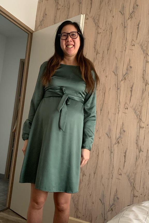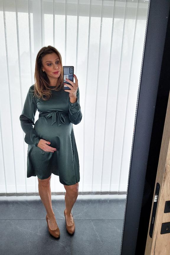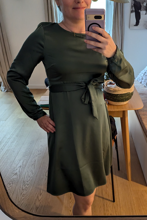 • Robe courte satinée verte • Ceinture incluse • Col rond • Fermeture bouton dans le dos • Couleur unie • Longueur des manches: 63 cm en taille S • Largeur de dos: 38 cm en taille S • Longueur totale: 90 cm en taille S