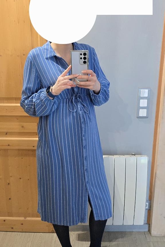 Cette robe chemise ร rayures bleues est un must-have pour toutes les futures mamans. Associez-la avec des baskets blanches pour un look dรฉcontractรฉ ou des sandales รฉlรฉgantes pour une touche plus sophistiquรฉe. Parfaite en toute saison. โข Robe chemise ร rayures โข Manches longues bouffantes โข Taille ajustable avec lien โข Longueur mi-mollet โข Fermeture boutonnรฉe devant
