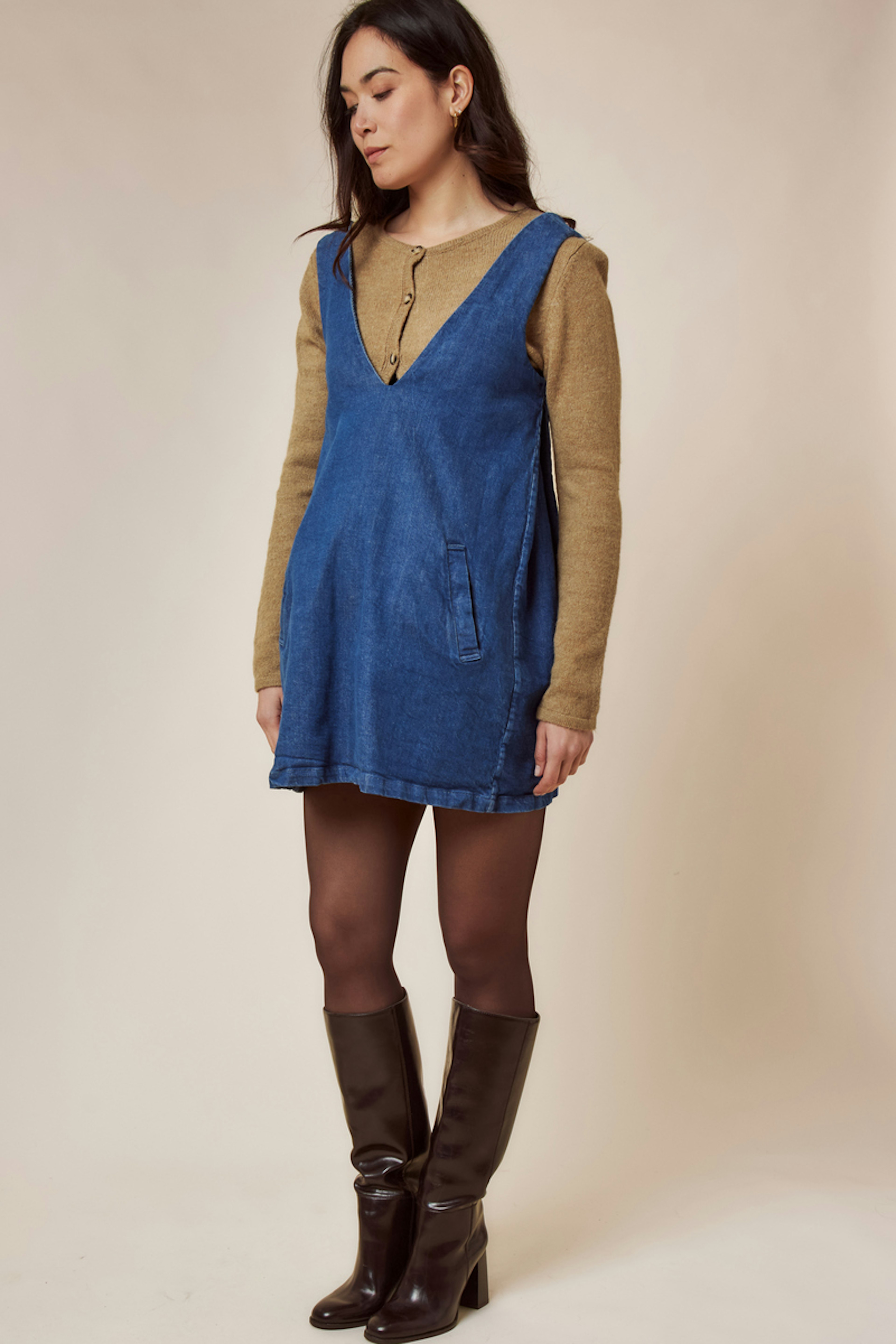 Portez cette robe avec un tee-shirt à motif animal pour un look décontracté. Parfait pour toutes les saisons. • Robe chasuble en denim • Coupe ample et confortable • Décolleté en V moderne • Soufflets ajustables sur les côtés • Poches XXL pratiques