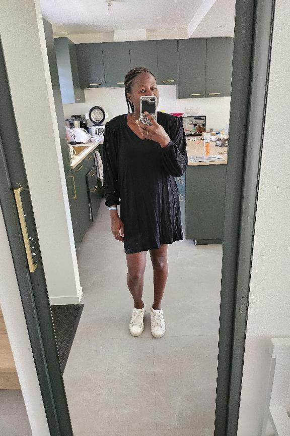 Associez cette robe noire avec des bottes hautes et une écharpe en laine pour un look cosy et stylé cet hiver. • Robe courte • Décolleté en V • Manches longues • Coupe ample • Spécial maternité