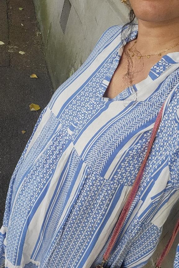 โTrรจs joli robe avec des couleurs qui rappellent la Grรจce, trรจs fluide et trรจs lรฉgรจre. Elle peut se porter ร n'importe quelle รฉtape de la grossesse.โ