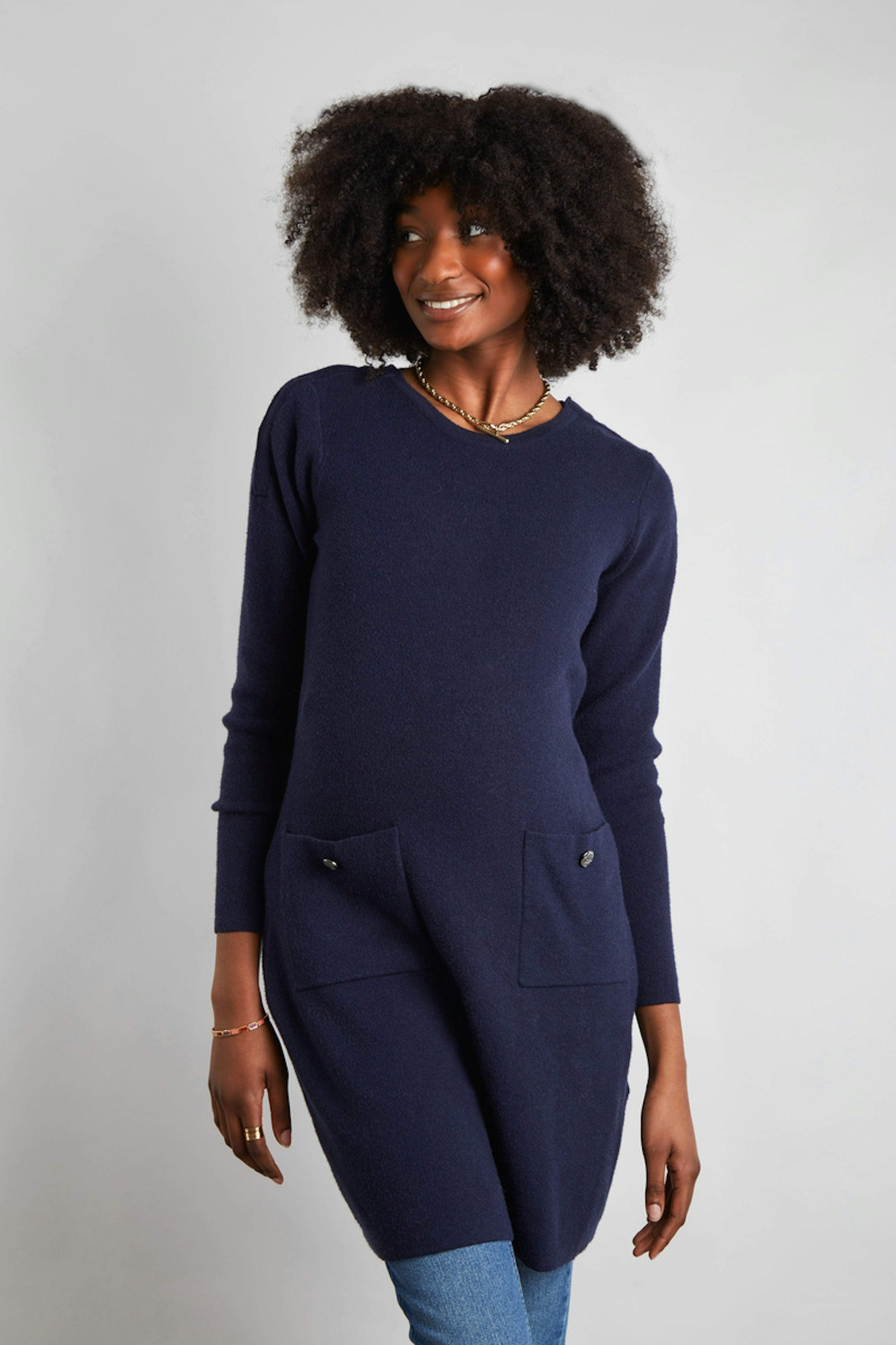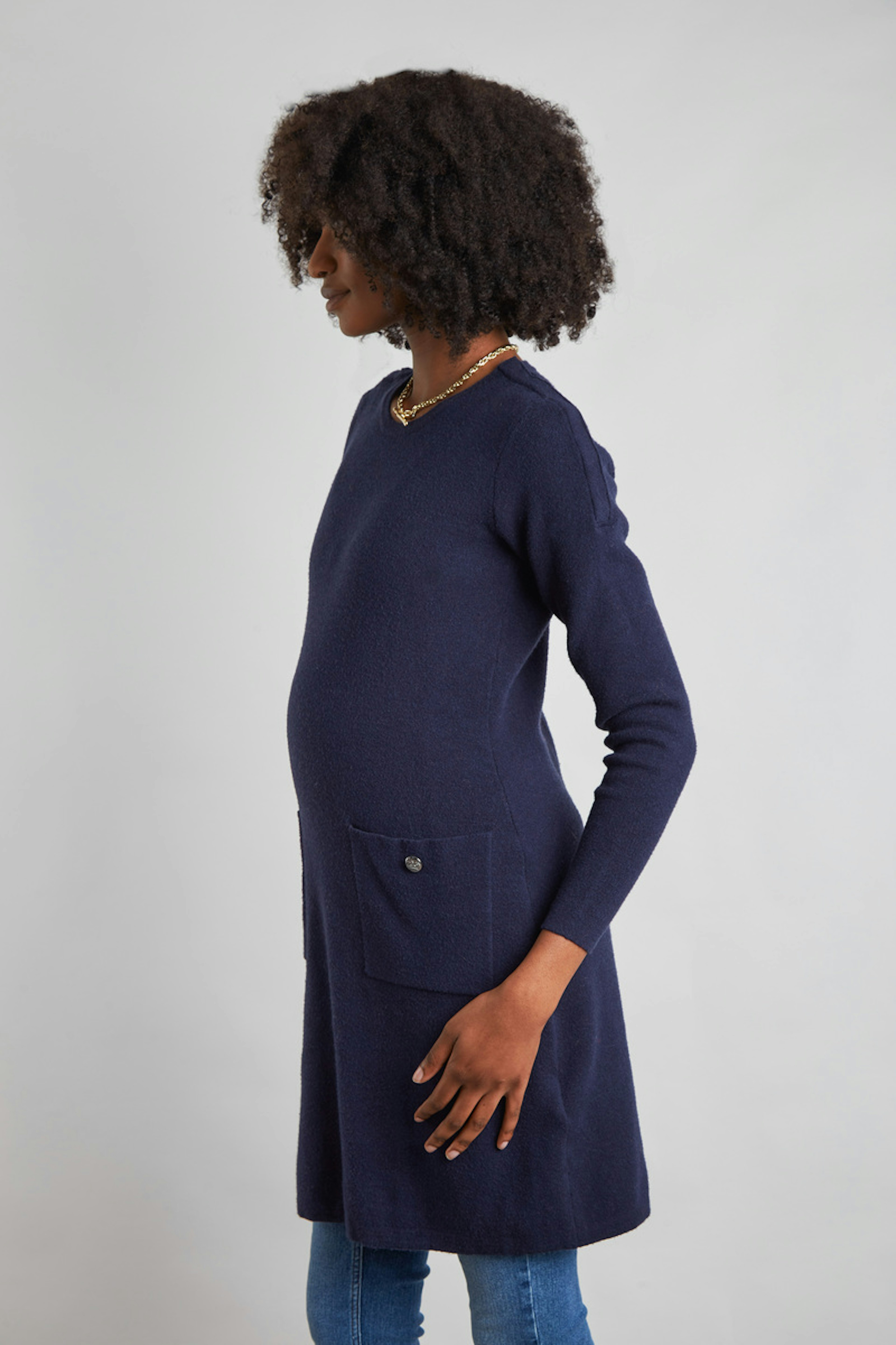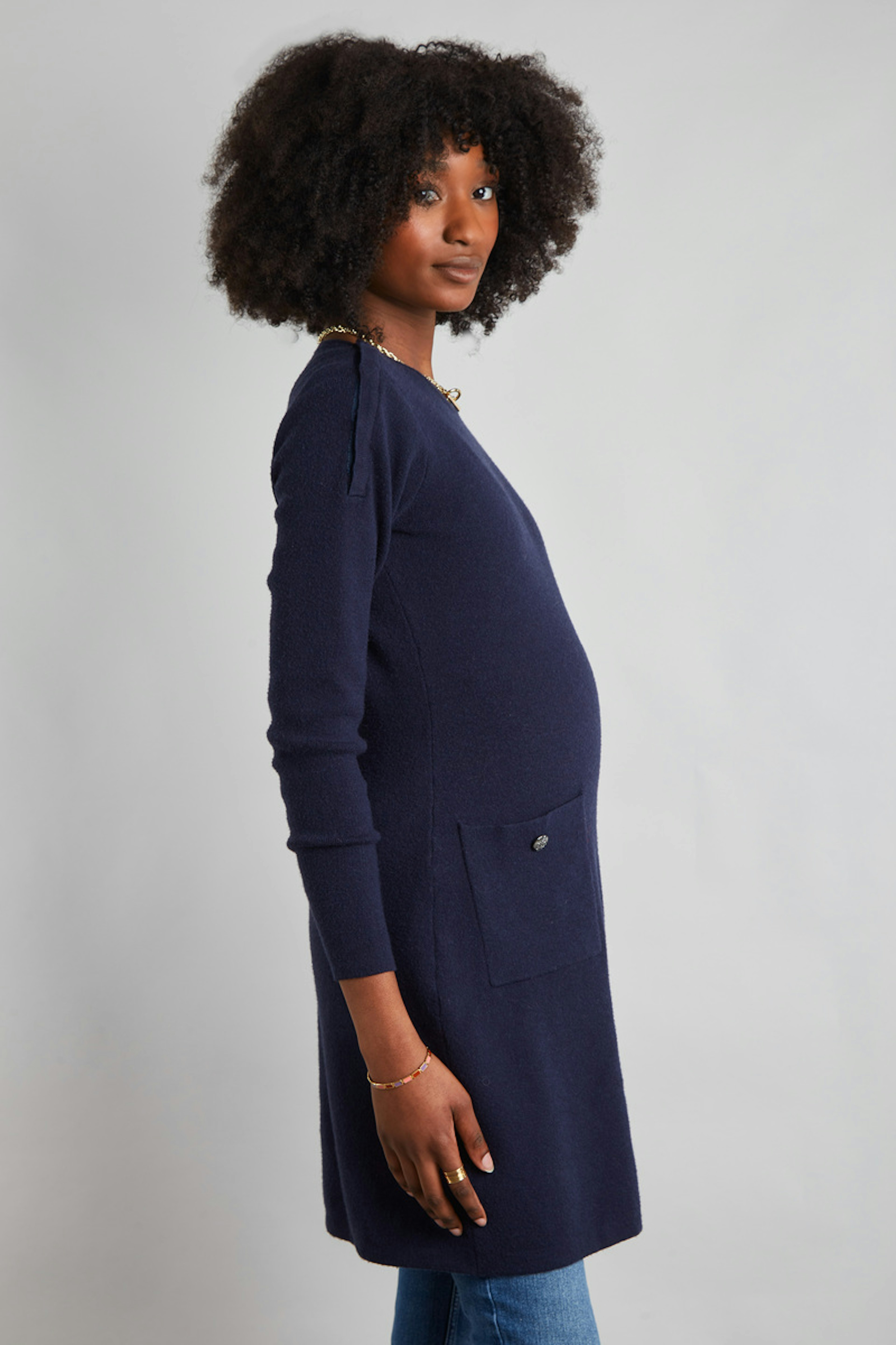 โข Maille stretch et douce โข Accรจs allaitement au niveau des รฉpaules โข Poches sur le devant โข Manches longues โข Au-dessus du genou
