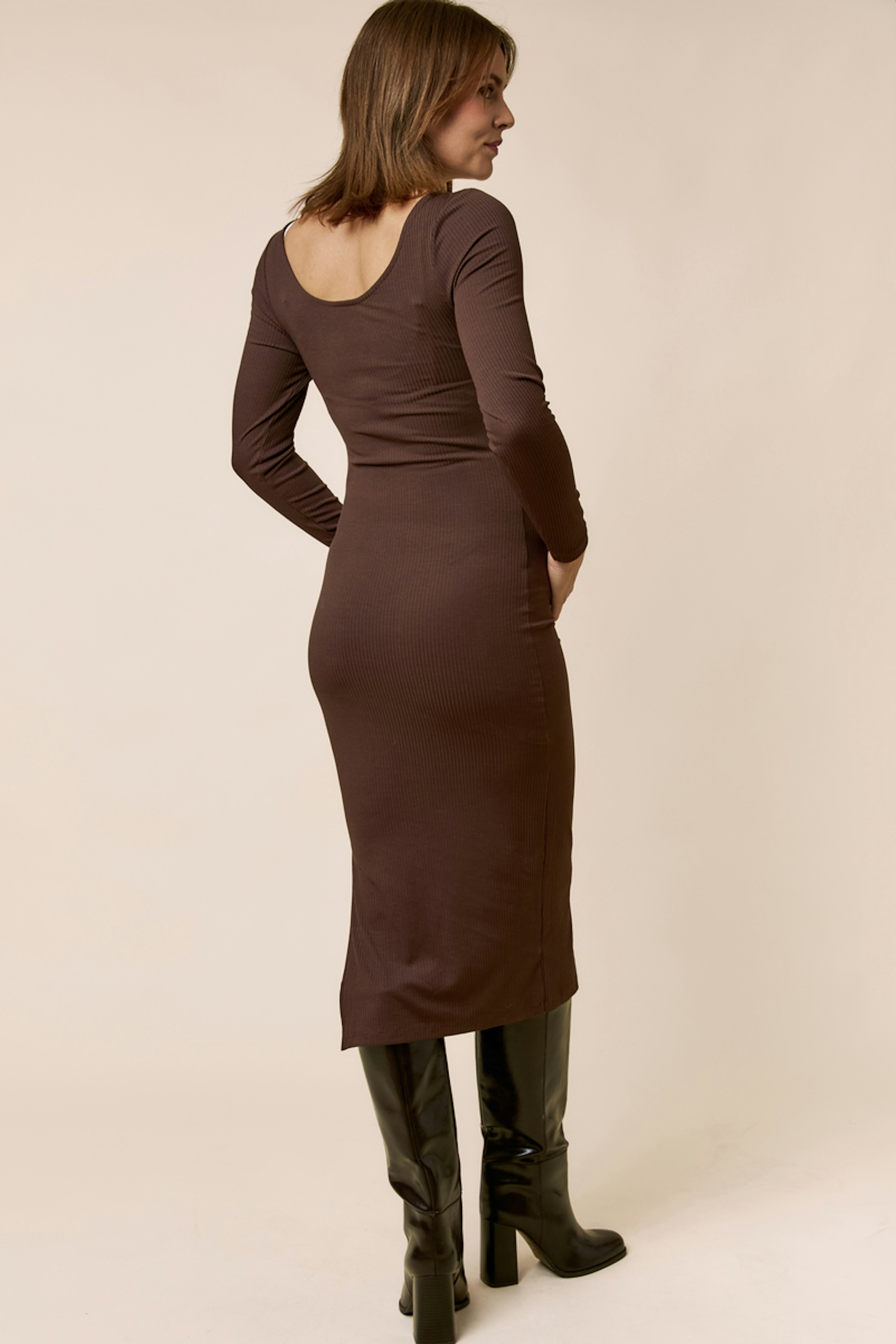 Optez pour des bottes hautes en cuir et un gilet cosy pour un style hivernal chic. • Robe longue • Coupe ajustée • Manches longues • Col rond • Matière extensible