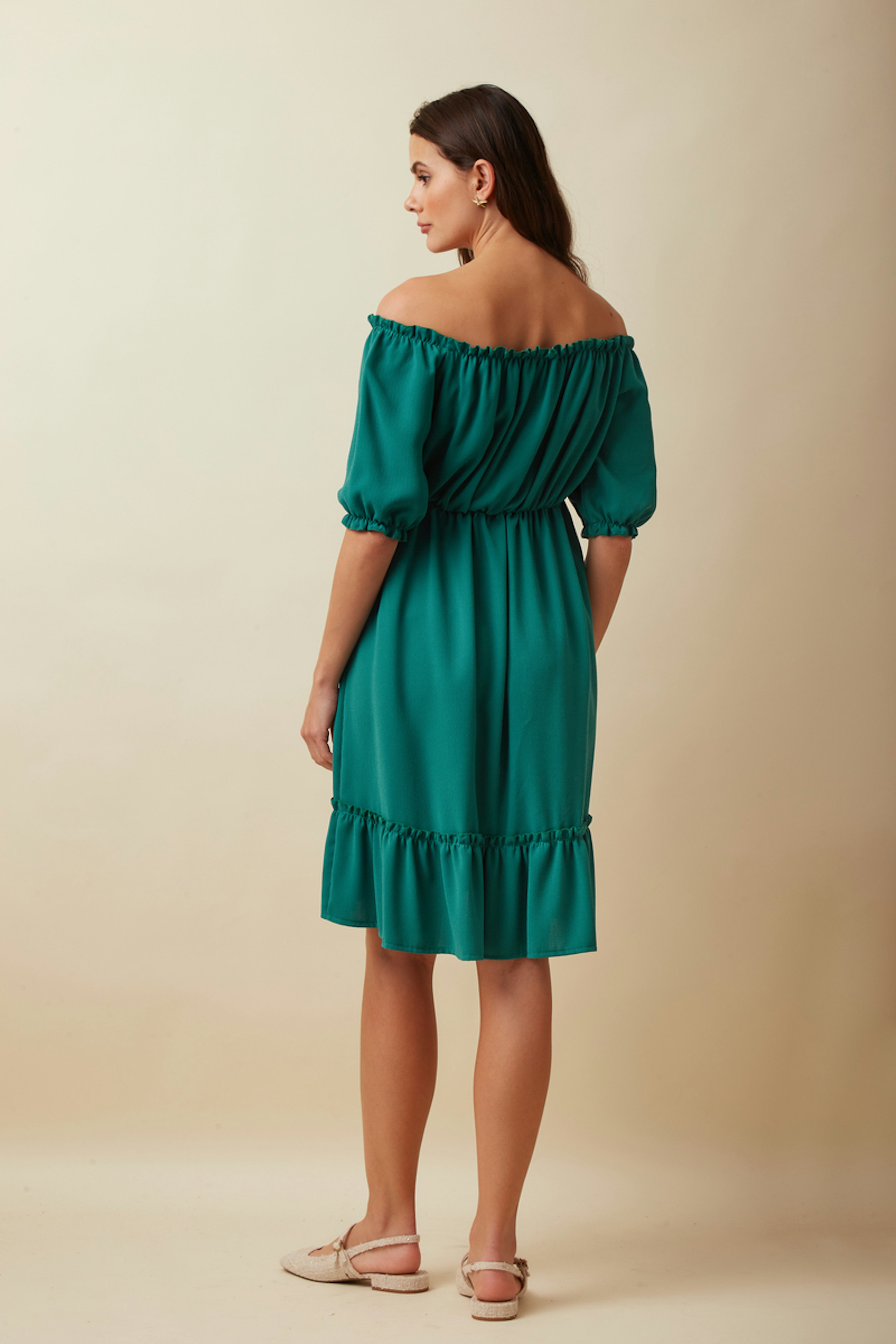 Associez cette robe bleu รฉclatante avec des sandales dorรฉes et un sac ร main en osier pour une touche bohรจme chic. Parfaite en toute saison. โข Robe midi en viscose โข Manches 3/4 bouffantes โข Encolure bateau โข Volants en bas de la robe