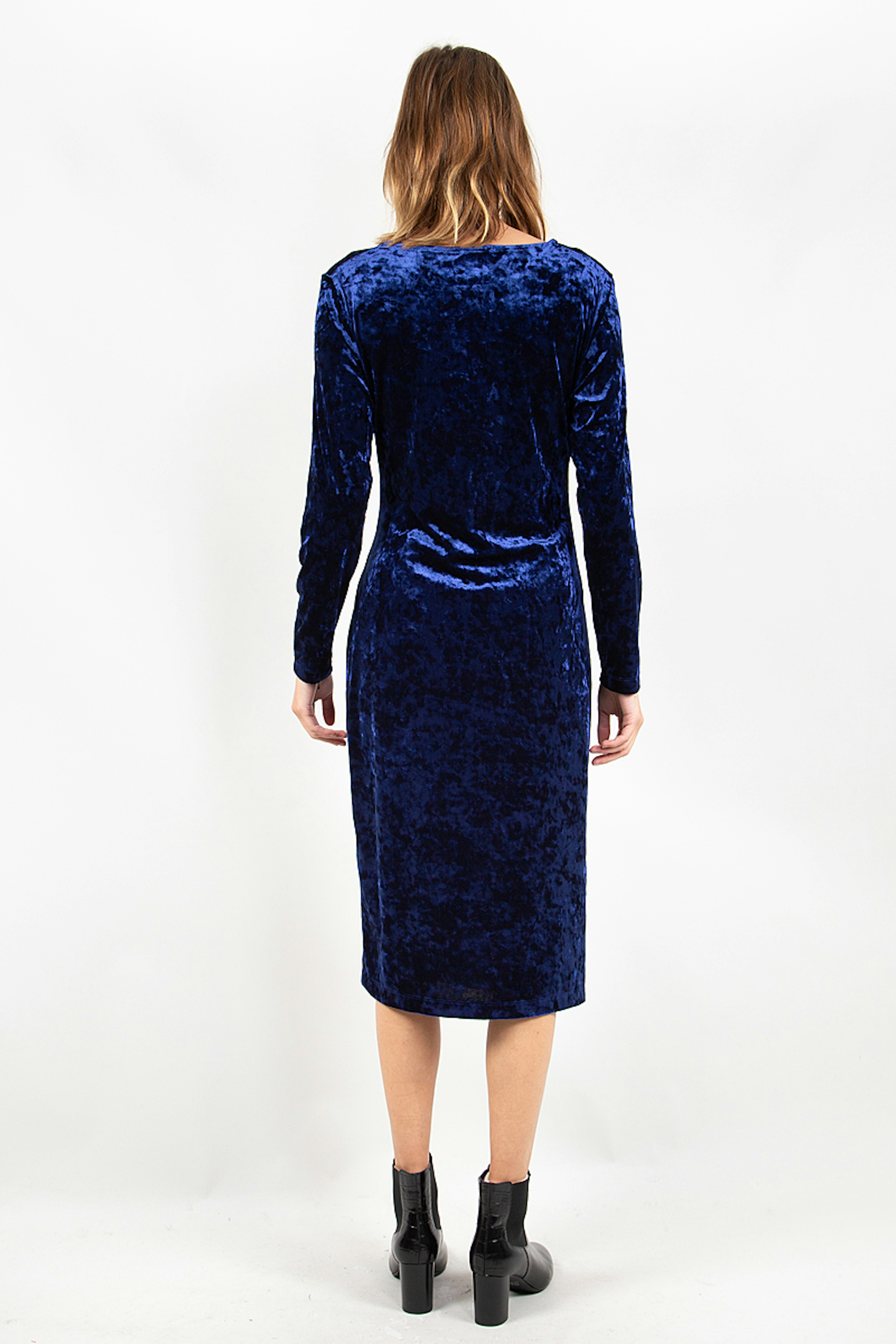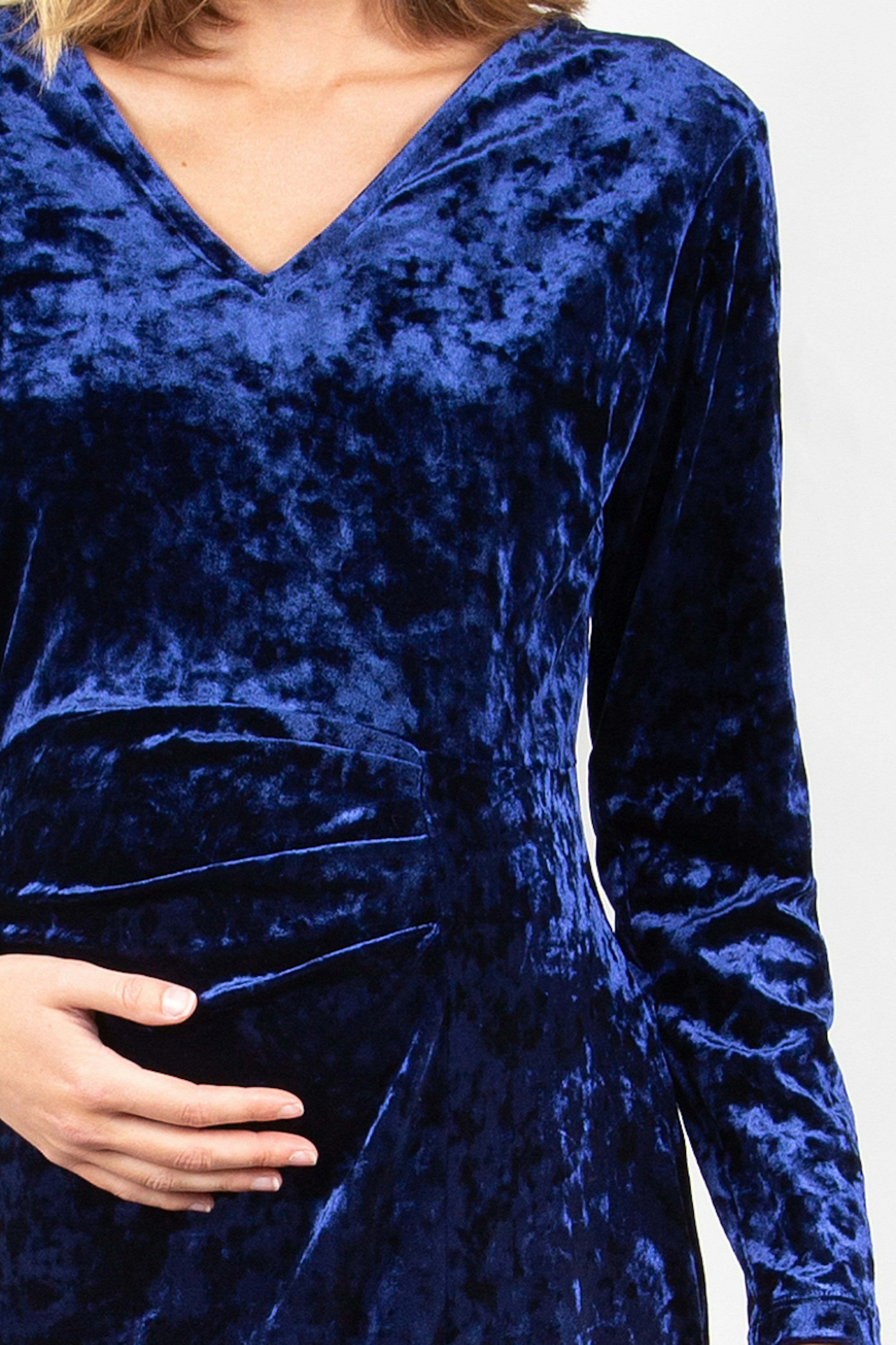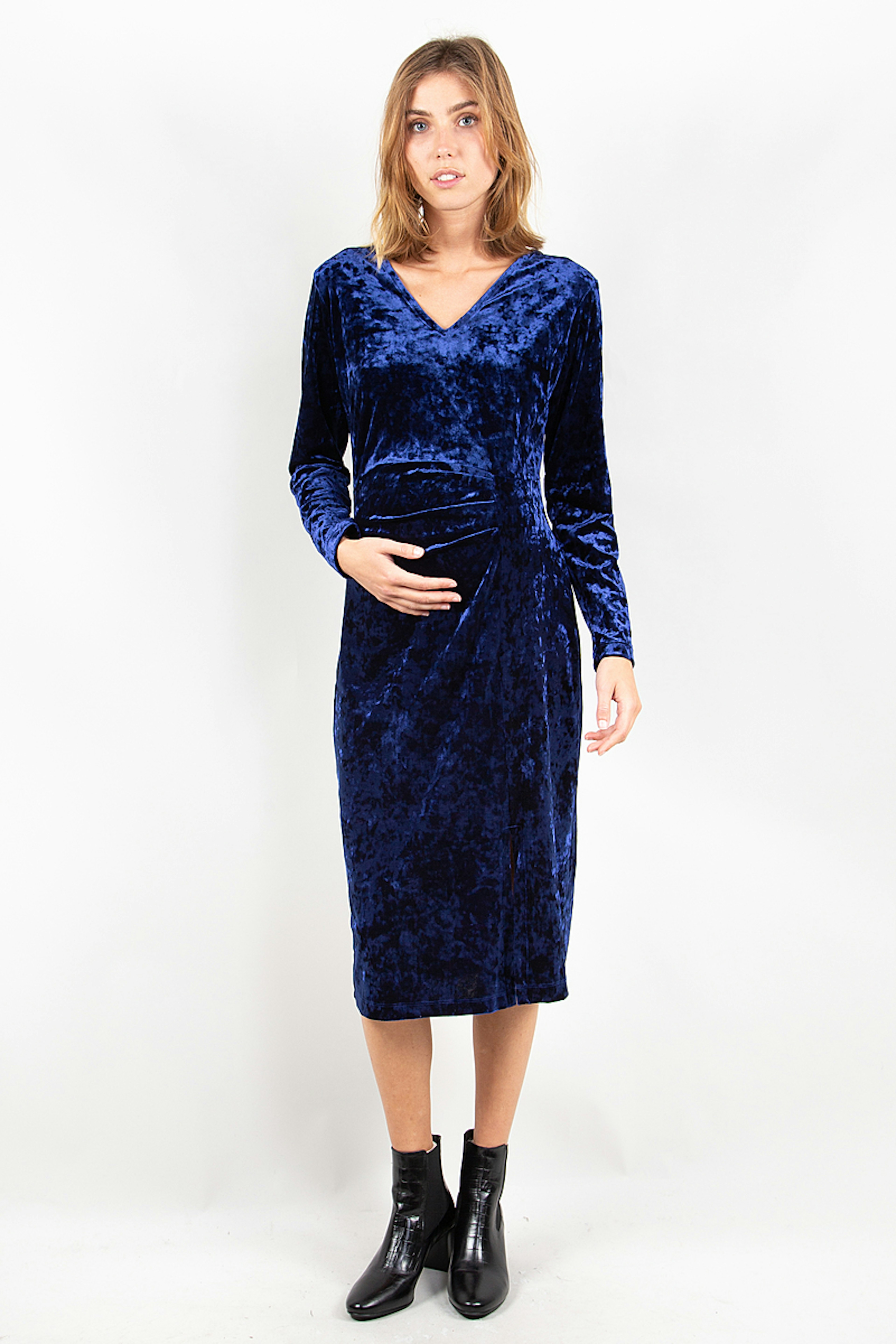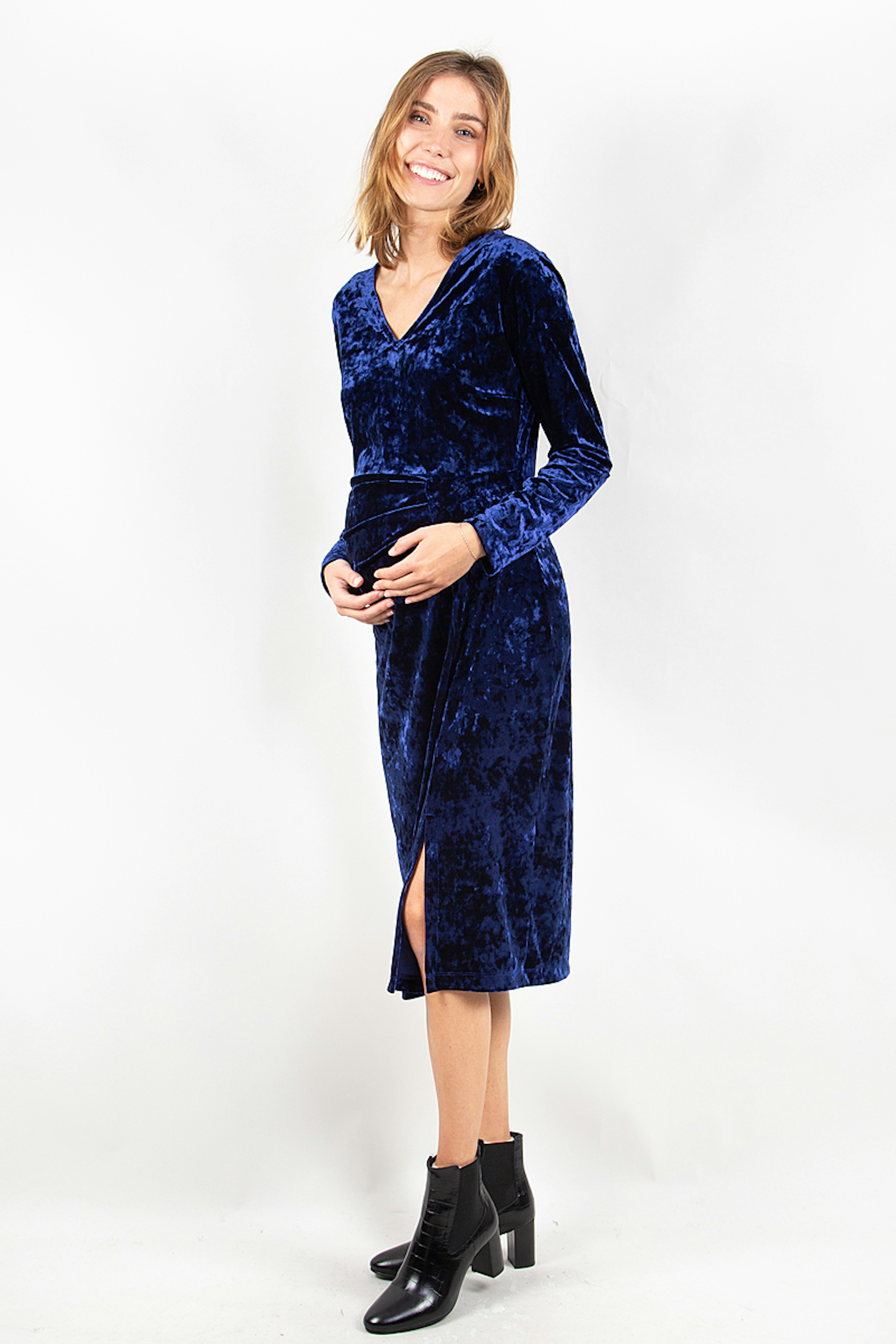 โข รlรฉgante de robe de grossesse en velours bleu marine au tombรฉ fluide โข Fente sur le devant de la jambe โข Longueur midi, sous le genou โข Manches longues et dรฉcolletรฉ en V