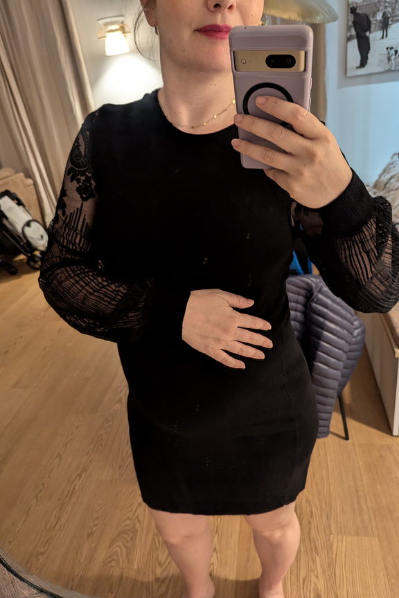 Pour un look chic et confortable tout au long de votre grossesse, associez cette robe noire avec des bottines en cuir et un manteau en laine. Parfait pour les journées fraîches d'hiver. • Robe courte • Manches longues en dentelle • Coupe ajustée • Col rond • Broderies sur les manches
