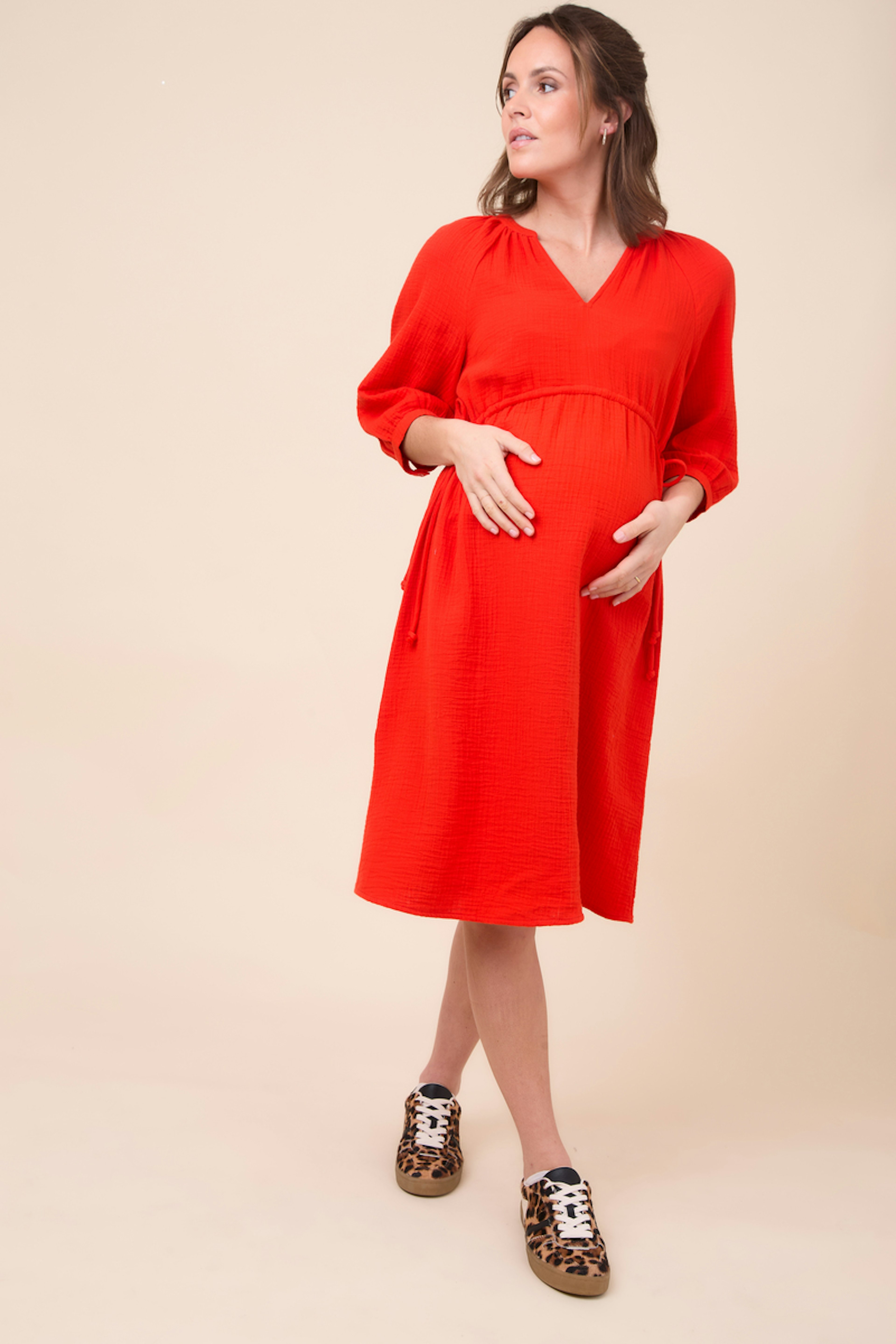Pour un look estival raffiné, associez cette robe à un chapeau en paille et des sandales neutres. • Robe en coton • Encolure en V • Manches trois-quarts • Taille empire • Couleur rouge vibrante