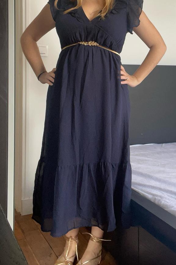 Pour un look élégant et confortable, associez cette magnifique robe bleue avec des sandales à talons et une pochette assortie. Idéale pour une sortie estivale ou une soirée habillée. Parfait en toute saison. • Robe maternité • Coupe empire • Décolleté en V • Volants aux épaules • Bas volanté