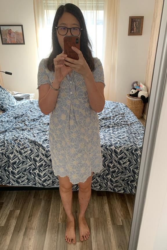 “Robe en 38 (une taille au dessus) pour pouvoir la porter en post accouchement et allaiter, mais trop petite et serrée à la taille ainsi qu’à la poitrine. Autrement les détails sont très jolies ainsi que les couleurs d’été.”
